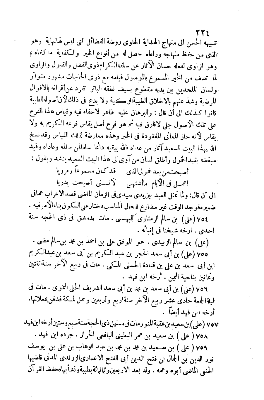 تنبيهه الْحسن إِلَى منهاج الْهِدَايَة الْحَاوِي رَوْضَة الْفَضَائِل الَّتِي لَيْسَ لَهَا نِهَايَة وَهُوَ الَّذِي من حفظ منهاجه وراعاه حصل لَهُ من أَنْوَاع الْخَيْر والكفاية مَا كَفاهُ وَهُوَ الرَّاوِي لفعله حسان الْآثَار عَن سلفه الْكِرَام ذَوي الْفضل وَالْقَبُول والراوي لما اتّصف من الْخَيْر المسموع بالموصول قِيَامه مَعَ ذَوي الْحَاجَات مَشْهُور متواتر ولسان الْمُلْحِدِينَ بَين يَدَيْهِ مقكوع بِسيف نطقه الباتر تفرد عَن أقرانه بالأقوال الْمَرِيضَة وشذ عَنْهُم بالأخلاق الطّيبَة الزكية وَلَا بدع فِي ذَلِك لِأَن أُصُوله الطّيبَة كَانُوا كَذَلِك إِلَى أَن قَالَ: والبرهان عَلَيْهِ ظَاهر لأخفاء فِيهِ وَقِيَاس هَذَا الْفَرْع على تِلْكَ الْأُصُول جلي لَا فَارق فِيهِ ثمَّ هُوَ فرع أصل يُقَاس فَرعه الْكَرِيم بِهِ وَلَا يُقَاس لِأَنَّهُ جَازَ الْمعَانِي المفقودة فِي الْخَبَر وَهَذِه مُعَارضَة لذَلِك الْقيَاس وَقد نسخ الله بِهَذَا الْبَيْت السعيد آثَار من عداهُ فَالله يبقيه دَائِما سلما لمن سالمه وعاداه وَقيد مبغضه بِقَيْد الخمول وَأطلق لِسَان من آوى إِلَى هَذَا الْبَيْت السعيد ينشد وَبقول: