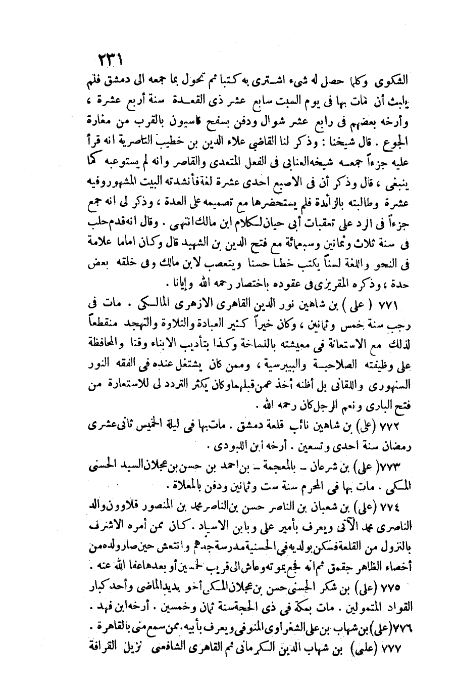 الشكوى وَكلما حصل لَهُ شَيْء اشْترى بِهِ كتبا ثمَّ تحول بِمَا جمعه إِلَى دمشق فَلم يلبث أَن مَاتَ بهَا فِي يَوْم السبت سَابِع عشر ذِي الْقعدَة سنة أَربع عشرَة، وأرخه بَعضهم فِي رَابِع عشر شَوَّال وَدفن بسفح قاسيون بِالْقربِ من مغارة الْجُوع. قَالَ شَيخنَا: وَذكر لنا القَاضِي عَلَاء الدّين خطيب الناصرية أَنه قَرَأَ عَلَيْهِ جُزْءا جمعه شَيْخه العنابي فِي)