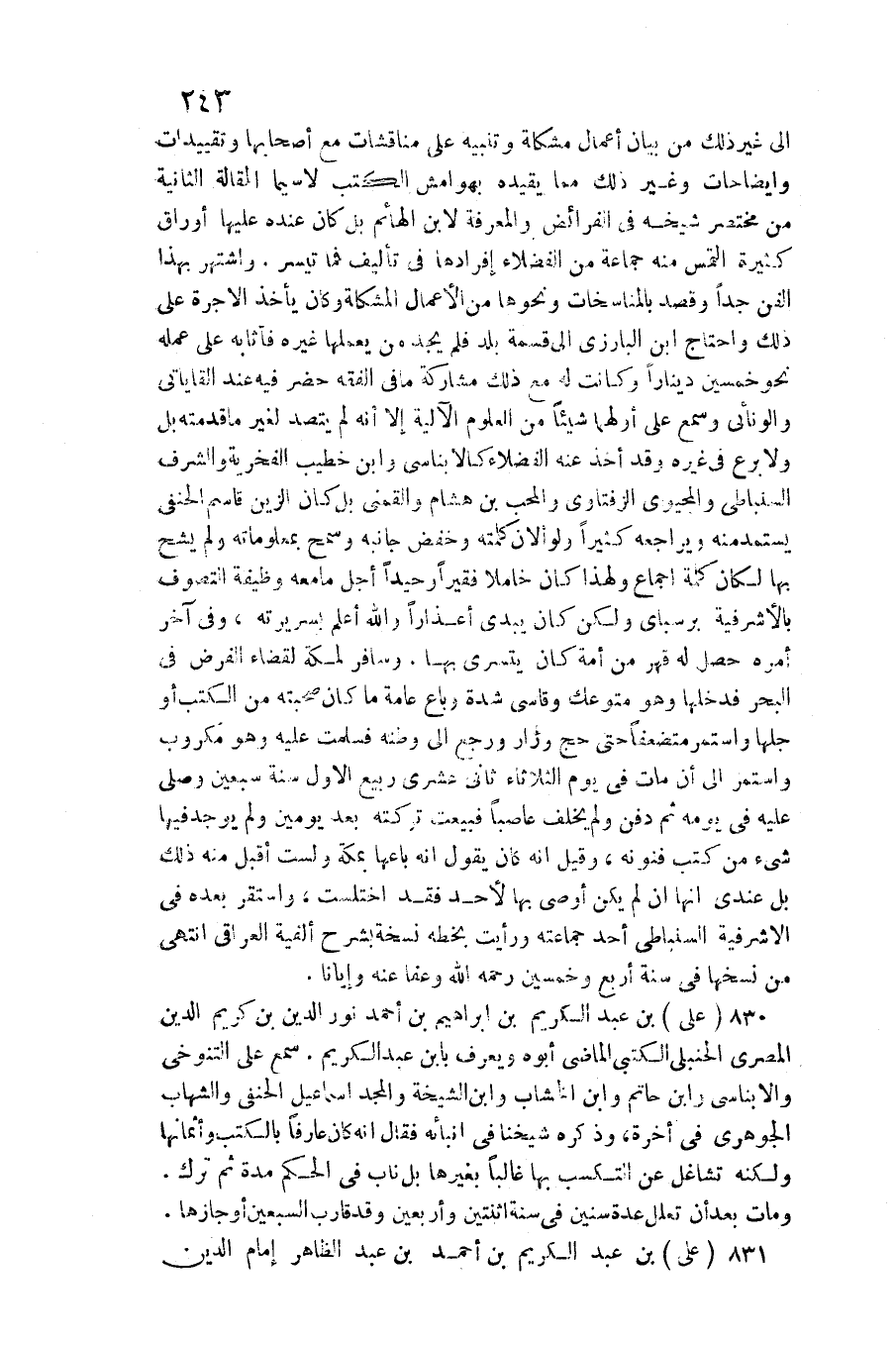 إِلَى غير ذَلِك من بَيَان أَعمال مشكلة وتنبيه على مناقشات مَعَ أَصْحَابهَا وتقييدات وإيضاحات وَغير ذَلِك مِمَّا يُقَيِّدهُ بهوامش الْكتب لَا سِيمَا القالة الثَّانِيَة من مُخْتَصر شَيْخه فِي الْفَرَائِض والمعرفة لِابْنِ الهائم بل كَانَ عِنْده عَلَيْهَا أوراق كَثِيرَة التمس مِنْهُ جمَاعَة من الْفُضَلَاء إفرادها فِي تأليف فَمَا تيَسّر. واشتهر بِهَذَا الْفَنّ جدا وَقصد بالمناسخات وَنَحْوهَا من الْأَعْمَال المشكلة وَكَانَ يَأْخُذ الْأُجْرَة على ذَلِك وَاحْتَاجَ ابْن الْبَارِزِيّ إِلَى قسْمَة بلد فَلم يجد من يعملها غَيره فأثابه على عمله نَحْو خمسين دِينَارا وَكَانَت لَهُ مَعَ ذَلِك مُشَاركَة مَا فِي الْفِقْه حضر فِيهِ عِنْد القاياتي والونائي وَسمع على أَولهمَا من الْعُلُوم الآلية إِلَّا أَنه لم يتصد لغير مَا قَدمته بل وَلَا برع فِي غَيره وَقد أَخذ عَنهُ الْفُضَلَاء كالأبناسي وَابْن خطيب الفخرية والشرف السنباطي والمجيوي الزفتاوي والمحب بن هِشَام والقمني بل كَانَ الزين قَاسم الْحَنَفِيّ يستمد مِنْهُ ويراجعه كثيرا وَلَو ألان كَلمته وخفض جَانِبه وسمح بمعلوماته وَلم يشح بهَا لَكَانَ كلمة إِجْمَاع وَلِهَذَا كَانَ خاملا فَقِيرا أجل مَا مَعَه وَظِيفَة التصوف بالأشرفية برسباي وَلَكِن كَانَ يُبْدِي أعذارا وَالله أعلم بسريرته، وَفِي آخر أمره حصل لَهُ فهر من أمه كَانَ يتسرى بهَا. وسافر لمَكَّة لقَضَاء الْفَرْض فِي الْبَحْر فَدَخلَهَا وَهُوَ متوعك وقاسى شدَّة وَبَاعَ عَامَّة مَا كَانَ صحبته من الْكتب أَو جلها وَاسْتمرّ متضعفا حَتَّى حج وزار وَرجع إِلَى وَطنه فَسلمت عَلَيْهِ وَهُوَ مكروب وَاسْتمرّ إِلَى أَن مَاتَ فِي يَوْم الثُّلَاثَاء ثَانِي عشري ربيع الأول سنة سبعين وَصلى عَلَيْهِ فِي يَوْمه ثمَّ دفن وَلم يخلف عاصبا فبيعت تركته بعد يَوْمَيْنِ وَلم يُوجد فِيهَا شَيْء من كتب فنونه، وَقيل أَنه كَانَ يَقُول أَنه بَاعهَا بِمَكَّة وَلست أقبل مِنْهُ ذَلِك بل عِنْدِي أَنَّهَا إِن لم يكن أوصى بهَا لأحد فقد اختلست، وَاسْتقر بعده فِي الأشرفية السنباطي أحد جماعته وَرَأَيْت بِخَطِّهِ نُسْخَة بشرح ألفية الْعِرَاقِيّ انْتهى من نسخهَا فِي سنة أَربع وَخمسين رَحمَه الله وَعَفا عَنهُ وإيانا.