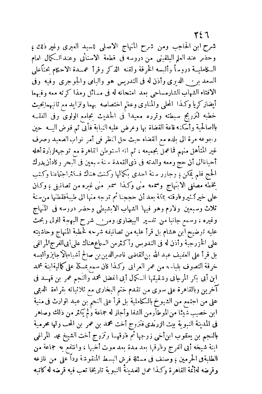 شرح ابْن الْحَاجِب وَمن شرح الْمِنْهَاج الْأَصْلِيّ للسَّيِّد العبري وَغير ذَلِك وَحضر عِنْد الْعلم البُلْقِينِيّ من دروسه فِي قِطْعَة الأسنائي وَعند الْكَمَال إِمَام الكاملية دروسا وَألبسهُ الْخِرْقَة ولقنه الذّكر وَقَرَأَ عُمْدَة الْأَحْكَام بحثا على السعد بن الديري وَأذن لَهُ فِي التدريس هُوَ والبامي والجوجري وَفِيه وَفِي الْإِفْتَاء الشهَاب الشارمساحي بعد امتحانه لَهُ فِي مسَائِل ومذاكرته مَعَه وَفِيهِمَا أَيْضا زَكَرِيَّا وَكَذَا الْمحلي والمناوي وعظيم اخْتِصَاصه بهما وتزايد مَعَ ثَانِيهمَا بِحَيْثُ خطبه لتزويج سبطته وَقَررهُ معيدا فِي الحَدِيث بِجَامِع الولوي وَفِي الْفِقْه بالصالحية وَأَسْكَنَهُ قاعة الْقُضَاة بهَا وَعرض عَلَيْهِ النِّيَابَة فَأبى ثمَّ فوض إِلَيْهِ حِين رُجُوعه مرّة إِلَى بَلَده مَعَ الْقَضَاء حَيْثُ حل النّظر فِي أَمر نواب الصَّعِيد وَصرف غير المتأهل مِنْهُم فَمَا عمل بِجَمِيعِهِ، ثمَّ إِنَّه استوطن الْقَاهِرَة مَعَ توجهه لزيارة أَهله أَحْيَانًا إِلَى أَن حج وَمَعَهُ والدته فِي ذِي الْقعدَة سنة سبعين فِي الْبَحْر وَكَاد أَن يدْرك الْحَج فَلم يُمكن وجاور سنة إِحْدَى بكمالها وَكنت هُنَاكَ فَكثر اجتماعنا وَكتب بِخَطِّهِ مصنفي الابتهاج وسَمعه مني وَكَذَا سمع مني غَيره من تصانيفي وَكَانَ على خير كثير وفارقته بِمَكَّة بعد أَن حجَجنَا ثمَّ توجه مِنْهَا إِلَى طيبَة فقطنها من سنة ثَلَاث وَسبعين ولازم وَهُوَ فِيهَا الشهَاب الأبشيطي وَحضر دروسه فِي الْمِنْهَاج وَغَيره، وَسمع جانبا من تَفْسِير الْبَيْضَاوِيّ وَمن شرح الْبَهْجَة للْوَلِيّ وَبحث عَلَيْهِ توضيح ابْن هِشَام بل قَرَأَ عَلَيْهِ من تصانيفه شَرحه لخطبة الْمِنْهَاج وحاشيته على الخزرجية وَأذن لَهُ فِي التدريس وَأكْثر من السماع هُنَاكَ على أبي الْفرج المراغي بل قَرَأَ على الْعَفِيف عبد الله بن القَاضِي نَاصِر الدّين صَالح أَشْيَاء بالأجايز وَألبسهُ خرقَة التصوف بلباسه من عمر)
