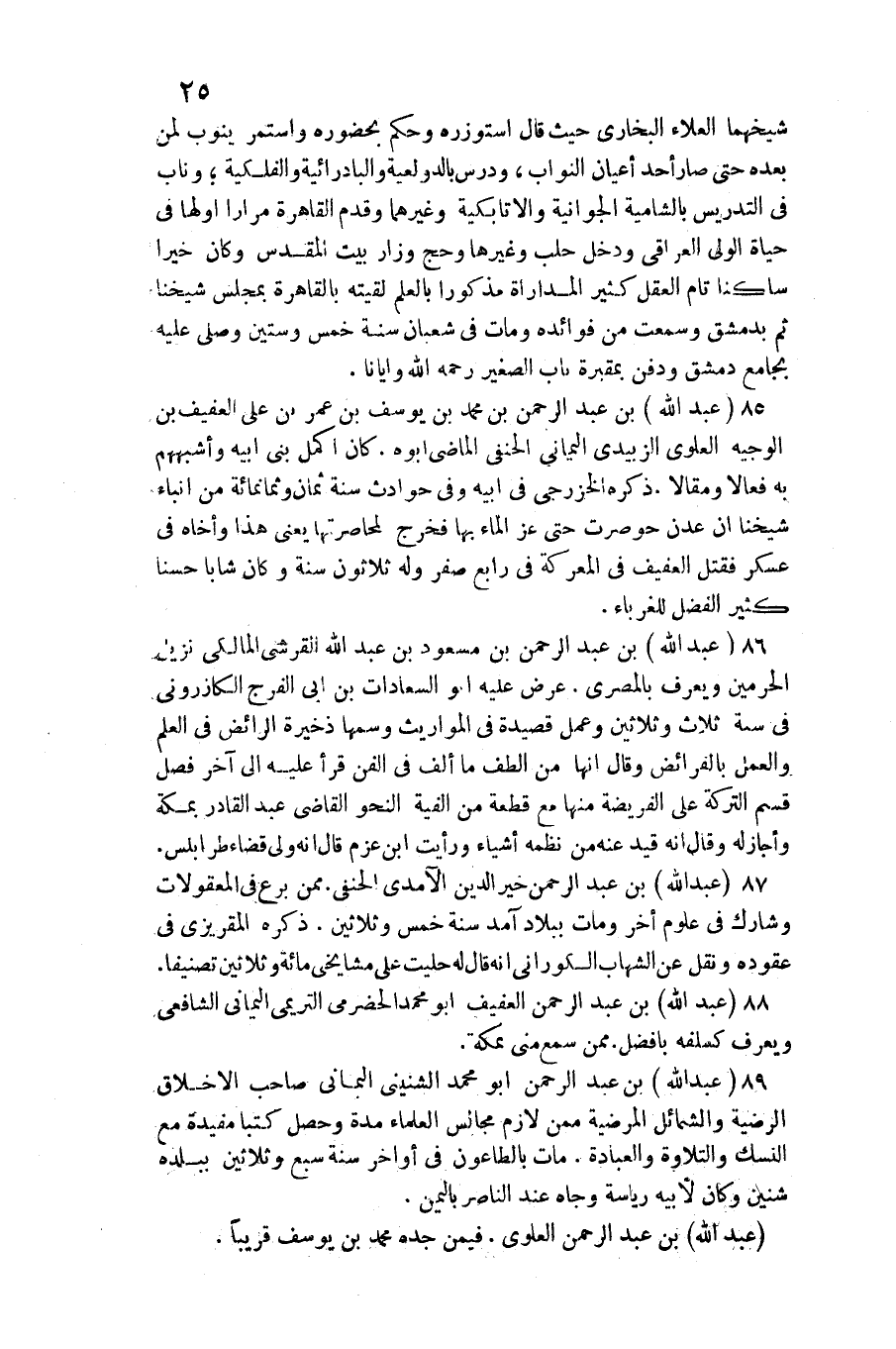 عبد الله بن عبد الرَّحْمَن بن مُحَمَّد بن يُوسُف بن عمر بن عَليّ الْعَفِيف بن الْوَجِيه الْعلوِي الزبيدِيّ الْيَمَانِيّ الْحَنَفِيّ الْمَاضِي أَبوهُ. كَانَ أكمل بني أَبِيه وأشبههم بِهِ فعالا ومقالا. ذكره الخزرجي فِي أَبِيه وَفِي حوادث سنة ثَمَان وَثَمَانمِائَة من أنباء شَيخنَا أَن عدن حوصرت حَتَّى عز المَاء بهَا فَخرج لمحاصرتها يَعْنِي هَذَا وأخاه فِي عَسْكَر فَقتل الْعَفِيف فِي المعركة فِي رَابِع صفر وَله ثَلَاثُونَ سنة وَكَانَ شَابًّا حسنا كثير الْفضل للغرباء.