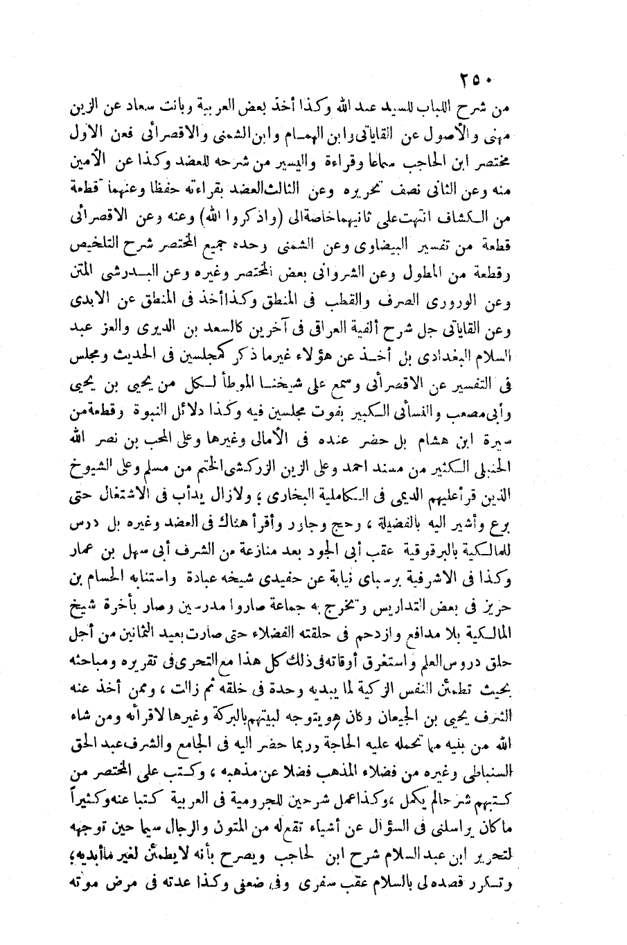 من شرح اللّبَاب للسَّيِّد عبد الله وَكَذَا أَخذ بعض الْعَرَبيَّة وَبَانَتْ سعاد عَن الزين مهنى وَالْأُصُول عَن القاياتي وَابْن الْهمام وَابْن الشمني والأقصرائي فَعَن الأول مُخْتَصر ابْن الْحَاجِب سَمَاعا وَقِرَاءَة واليسير من شَرحه للعضد وَكَذَا عَن الْأمين مِنْهُ وَعَن الثَّانِي نصف تحريره وَعَن الثَّالِث الْعَضُد بقرَاءَته حفظا وعنهما قِطْعَة من الْكَشَّاف انْتَهَت على ثَانِيهمَا خَاصَّة إِلَى واذْكُرُوا الله وَعنهُ عَن الأقصرائي قِطْعَة من تَفْسِير الْبَيْضَاوِيّ وَعَن الشمني وَحده جَمِيع الْمُخْتَصر شرح التَّلْخِيص وَقطعَة من المطول وَعَن الشرواني بعض الْمُخْتَصر وَغَيره وَعَن البدرشي الْمَتْن وَعَن الوروري الصّرْف والقطب فِي الْمنطق وَكَذَا أَخذ فِي الْمنطق عَن الأبدي وَعَن القاياتي جلّ شرح ألفية الْعِرَاقِيّ فِي آخَرين كالسعد بن الديري والعز عبد السَّلَام الْبَغْدَادِيّ بل أَخذ عَن هَؤُلَاءِ غير مَا ذكر كمجلسين فِي الحَدِيث ومجلس فِي التَّفْسِير عَن الأقصرائي وَسمع على شَيخنَا الْمُوَطَّأ لكل من يحيى بن يحيى وَأبي مُصعب وَالنَّسَائِيّ الْكَبِير بفوت مجلسين فِيهِ وَكَذَا دَلَائِل النُّبُوَّة وَقطعَة من سيرة ابْن هِشَام بل حضر عِنْده فِي الأمالي وَغَيرهَا وعَلى الْمُحب بن نصر الله الْحَنْبَلِيّ الْكثير من مُسْند أَحْمد وعَلى الزين الزَّرْكَشِيّ الْخَتْم من)