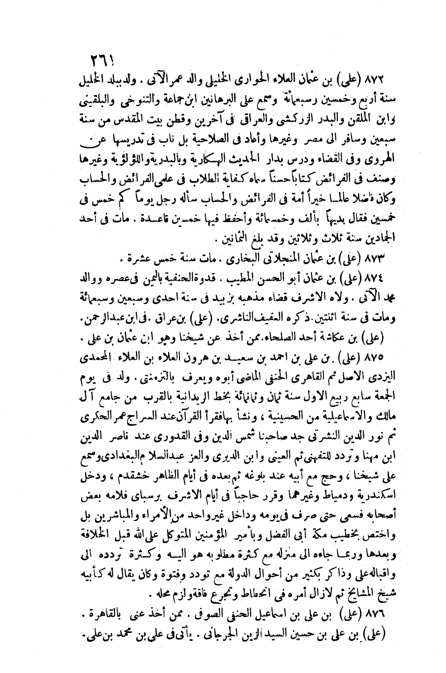 عَليّ بن عُثْمَان أَبُو الْحسن المطيب. قدوة الْحَنَفِيَّة بِالْيمن فِي عصره ووالد مُحَمَّد الْآتِي. وولاه الْأَشْرَف قَضَاء مذْهبه بزبيد فِي سنة إِحْدَى وَسبعين وَسَبْعمائة وَمَات فِي سنة اثْنَتَيْنِ. ذكره العفيفي النَّاشِرِيّ. عَليّ بن عراق. ابْن عبد الرَّحْمَن.