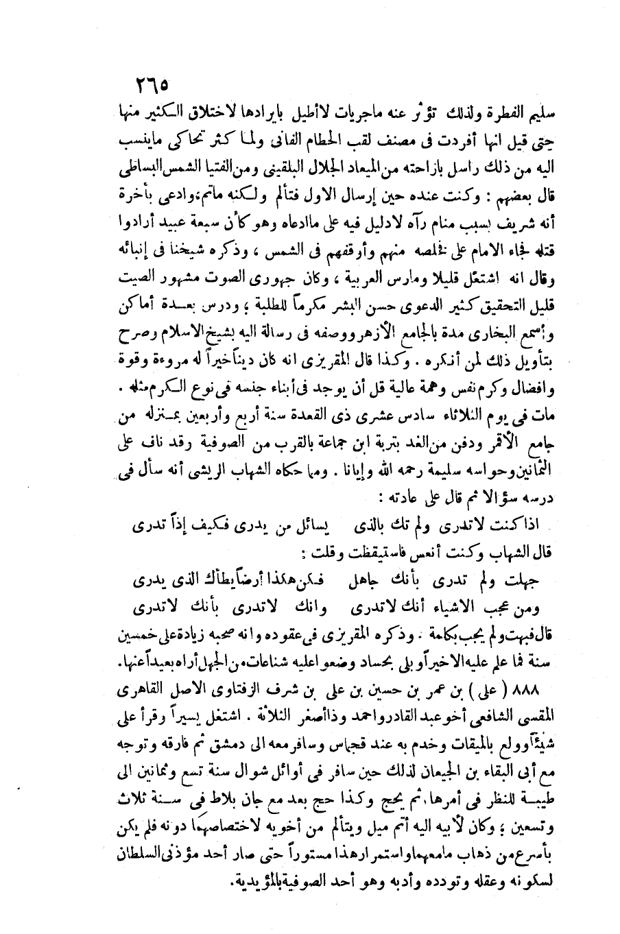 قَالَ فبهت وَلم يجب بِكَلِمَة. وَذكره المقريزي فِي عقوده وَأَنه صَحبه زِيَادَة على خمسين سنة فَمَا علم عَلَيْهِ إِلَّا خيرا وبلي بحساد وضعُوا عَلَيْهِ شناعات من الْجَهْل وَأرَاهُ بَعيدا عَنْهَا.