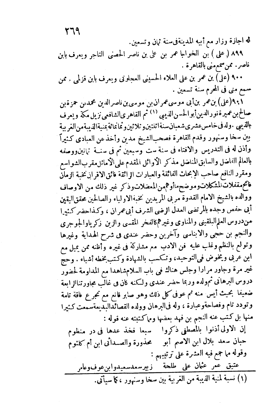 حجي والأبناسي وَآخَرين وَحضر عِنْدِي فِي شرح الْهِدَايَة وَغَيرهَا وتولع بالنظم وَغلب عَلَيْهِ فن الْأَدَب مَعَ مُشَاركَة فِي غَيره وَأَظنهُ مِمَّن يمِيل مَعَ ابْن عَرَبِيّ ويخوض فِي التَّوْحِيد، وتكسب بِالشَّهَادَةِ وَكتب بِخَطِّهِ أَشْيَاء. وَحج غير مرّة وجاور مرَارًا وَجلسَ هُنَاكَ فِي بَاب السَّلَام شَاهدا مَعَ المداومة لحضور دروس البرهاني ثمَّ وَلَده وَرُبمَا حضر عِنْدِي وَلكنه كَانَ فِي غَالب مجاورتنا الرَّابِعَة ضَعِيفا بِحَيْثُ أيس مِنْهُ ثمَّ عَوْف كل ذَلِك وَهُوَ صابر قَانِع مَعَ تجرع فاقة تَامَّة وتودد تَامّ وفصاحة وَعبارَة، وَله فِي الْبُرْهَان وَولده القصائد البديعة سَمِعت كثيرا مِنْهَا بل كتب عَنهُ النَّجْم بن فَهد بَعْضهَا وَمِمَّا كتبته عَنهُ قَوْله: