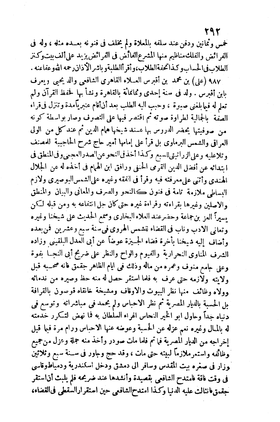 على التصوف وَصَارَ بِوَاسِطَة كَونه من صوفيتها يحضر الدُّرُوس بهَا عِنْد شيخها همام الدّين ثمَّ عِنْد كل من الْوَلِيّ الْعِرَاقِيّ وَالشَّمْس الْبرمَاوِيّ بل قَرَأَ على إمامها أَمِير حَاج شرح الحاجبية للْمُصَنف وتلا عَلَيْهِ وعَلى الزراتيتي للسبع وَكَذَا أَخذ فِي النُّصُوص الصَّدْر العجمي وَفِي الْمنطق فِي ابْتِدَائه عَن أفضل الدّين القرمي الْحَنَفِيّ ورافق ابْن الْهمام فِي أَخذه لَهُ عَن الْجلَال الْهِنْدِيّ وَأثْنى على مَعْرفَته فِيهِ وَقَرَأَ فِي الْفِقْه وَغَيره على الشَّمْس البوصيري ولازم الْبِسَاطِيّ مُلَازمَة تَامَّة فِي فنون كالنحو وَالصرْف والمعاني وَالْبَيَان والمنطق والأصلين وَغَيرهَا بقرَاءَته وَقِرَاءَة غَيره حَتَّى كَانَ جلّ انتفاعه بِهِ وَمن قبله لَكِن يَسِيرا الْعِزّ بن جمَاعَة وَحضر عِنْد الْعَلَاء البُخَارِيّ وَسمع الحَدِيث على شَيخنَا وَغَيره وتعانى الْأَدَب وناب فِي الْقَضَاء للشمس الْهَرَوِيّ فِي سنة سبع وَعشْرين فَمن بعده وأضاف إِلَيْهِ شَيخنَا بِأخرَة قَضَاء الجيزة عوضا عَن أبي الْعدْل البُلْقِينِيّ وزاده الشّرف الْمَنَاوِيّ النحرارية والفيوم والواح وَالنَّظَر على ضريح أبي النجا بفوة وعَلى جَامع منوف وعمره من مَاله وَذَلِكَ أَيَّام الظَّاهِر جقمق فَإِنَّهُ صَحبه قبل ولَايَته ولازمه حَتَّى عرف بِهِ فَلَمَّا اسْتَقر حصل لَهُ مِنْهُ حَظّ وصيره من ندمائه وولاه وظائف مِنْهَا نظر الْبيُوت والأوقاف ومشيخة خانقاه قوصون بالقرافة بل الْحِسْبَة بالديار المصرية ثمَّ نظر الأحباس وَلم يحمد فِي مُبَاشَرَته وَتوسع فِي دُنْيَاهُ جدا وحاول أَبُو الْخَيْر النّحاس إغراء السُّلْطَان بِهِ فَمَا نَهَضَ لتكرر خدمته لَهُ بِالْمَالِ وَغَيره نعم عَزله عَن الْحِسْبَة وعوضه عَنْهَا الأحباس ورام مرّة فِيمَا قيل إِخْرَاجه من الديار المصرية فَمَا تمّ فَلَمَّا مَاتَ صودر وَأخذ مِنْهُ جملَة وعزل من جَمِيع وظائفه وَاسْتمرّ ملازما لبيته حَتَّى مَاتَ، وَقد حج وجاور فِي سنة سبع وَثَلَاثِينَ وزار فِي صغره بَيت الْمُقَدّس وسافر إِلَى دمشق وَدخل إسكندرية ودمياط وقاسى فِي وَقت فلقَة فامتدح الشَّافِعِي بقصيدة وأنشدها عِنْد ضريحه فَلم يلبث أَن اسْتَقر جقمق فانثالت عَلَيْهِ الدُّنْيَا وَكَذَا امتدح الشَّافِعِي حِين اسْتِقْرَار السَّقطِي فِي الْقَضَاء،