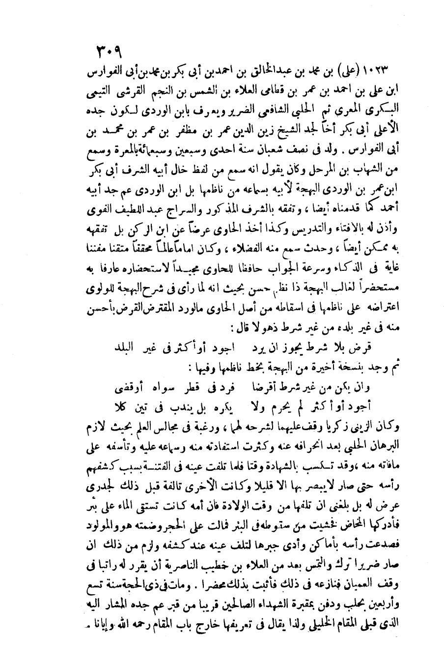 وَكَانَ الزيني زَكَرِيَّا وقف عَلَيْهِمَا لشرحه لَهما، ورغبة فِي مجَالِس الْعلم بِحَيْثُ لَازم الْبُرْهَان الْحلَبِي بعد انحرافه عَنهُ وَكَثُرت استفادته مِنْهُ وسماعه عَلَيْهِ وتأسفه على مَا فَاتَهُ مِنْهُ، وَقد تكسب بِالشَّهَادَةِ وقتا فَلَمَّا تلفت عينه فِي الْفِتْنَة بِسَبَب كشفهم رَأسه حَتَّى صَار لَا يبصر بهَا إِلَّا قَلِيلا وَكَانَت الْأُخْرَى تالفة قبل ذَلِك لجدري عرض لَهُ بل بَلغنِي أَن تلفهَا من وَقت الْولادَة فَإِن أمه كَانَت تستقي المَاء على بِئْر فأدركها الْمَخَاض فَخَشِيت من سُقُوطه فِي الْبِئْر فمالت على الْحجر وضمته هُوَ والمولود فصدعت رَأسه بأماكن وَأدّى جبرها لتلف عينه عِنْد كشفه وَلزِمَ من ذَلِك أَن صَار ضريرا ترك وَالْتمس بعد من الْعَلَاء بن خطيب الناصرية أَن يُقرر لَهُ راتبا فِي وقف العميان فنازعه فِي ذَلِك فَأثْبت بذلك محضرا. وَمَات فِي ذِي الْحجَّة سنة تسع وَأَرْبَعين بحلب وَدفن بمقبرة الشُّهَدَاء الصَّالِحين قَرِيبا من قبر عَم جده الْمشَار إِلَيْهِ الَّذِي قبلي الْمقَام الخليلي وَلذَا يُقَال فِي تَعْرِيفهَا خَارج بَاب الْمقَام رَحمَه الله وإيانا.