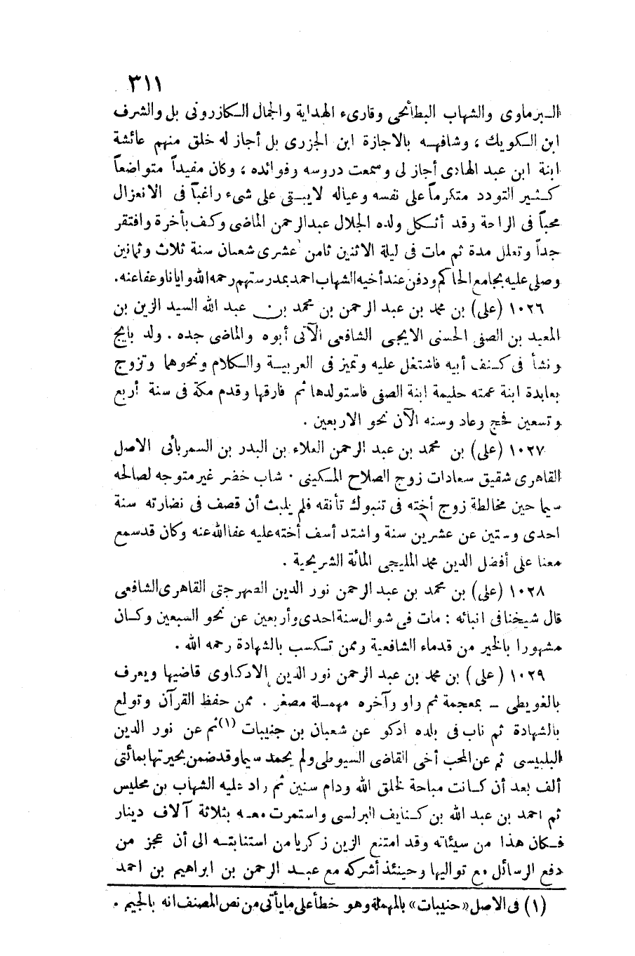 الْبرمَاوِيّ والشهاب البطائحي وقارئ الْهِدَايَة وَالْجمال الكازوني بل والشرف ابْن الكويك، وشافهه بِالْإِجَازَةِ ابْن الْجَزرِي بل أجَاز لي وَسمعت دروسه وفوائده، وَكَانَ مُفِيدا متواضعا كثير التودد متكرما على نَفسه وَعِيَاله لَا يبْقى على شَيْء رَاغِبًا فِي الانعزال محبا فِي الرَّاحَة وَقد أنكل وَلَده الْجلَال عبد الرَّحْمَن الْمَاضِي وَكَيف بِأخرَة وافتقر جدا وتعلل مُدَّة ثمَّ مَاتَ فِي لَيْلَة الِاثْنَيْنِ ثامن عشري شعْبَان سنة ثَلَاث وَثَمَانِينَ وَصلى عَلَيْهِ بِجَامِع الْحَاكِم وَدفن عِنْد أَخِيه الشهَاب أَحْمد بمدرستهم رَحمَه الله وإيانا وَعَفا عَنهُ.)