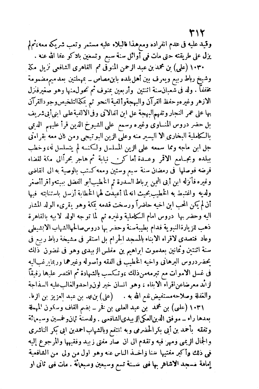 الشُّيُوخ الَّذين قَرَأَ عَلَيْهِم الديمي بالكاملية البُخَارِيّ إِلَّا الْيَسِير مِنْهُ وعَلى الزين البوتيجي وَمن كَانَ مَعَه بِقِرَاءَتِي جلّ ابْن مَاجَه وَمِمَّا سَمعه على الزين المسلسل وَلكنه لم يتسلسل لَهُ، وخطب بِبَلَدِهِ وبجامع الْأَقْمَر وعدة أَمَاكِن نِيَابَة ثمَّ هَاجر بحرا إِلَى مَكَّة لقَضَاء فَرْضه فوصلها فِي رَمَضَان سنة سبع وَسِتِّينَ وَمَعَهُ كتب بِالْوَصِيَّةِ بِهِ إِلَى القَاضِي وَغَيره فأنزله ابْن أبي الْيمن برباط السِّدْرَة ثمَّ الْخَطِيب أَبُو الْفضل ببيته وأقرأ أَصْغَر ولديه واغتبط بِهِ الْخَطِيب بِحَيْثُ أَنه لما أُعِيدَت لَهما الخطابة أرسل باستنابته فِيهَا أَن لم يكن الْمُحب ابْن أَخِيه حَاضرا ورسخت قدمه بِمَكَّة وَهُوَ يقرئ الْوَلَد الْمشَار إِلَيْهِ وَحضر بهَا دروس أَمَام الكاملية وَغَيره ثمَّ لما توجه الْوَلَد لِأَبِيهِ بِالْقَاهِرَةِ ذهب للزيارة النَّبَوِيَّة فدام بِطيبَة سنة وَحضر بهَا دروس صالحها الشهَاب الأبشيطي وَعَاد فتصدى لإقراء الْأَبْنَاء بِالْمَسْجِدِ الْحَرَام بل اسْتَقر فِي مشيخة رِبَاط ربيع فِي سنة اثْنَتَيْنِ وَثَمَانِينَ بعد موت إِبْرَاهِيم بن مُفلس الزبيدِيّ وَهُوَ فِي غُضُون ذَلِك يحضر دروس البرهاني وأخيه الْخَطِيب فِي الْفِقْه وأصوله وَغَيرهمَا وَرُبمَا يرغب إِلَيْهِ فِي غسل الْأَمْوَات مَعَ تبرمه من ذَلِك، وتكسب بِالشَّهَادَةِ ثمَّ اقْتصر عَلَيْهَا رَفِيقًا لزائد معرضًا عَن إقراء الْأَبْنَاء، وَهُوَ إِنْسَان خير لون وَاحِد وَالْغَالِب عَلَيْهِ السذاجة والغفلة وصلاحه مستفيض نفع الله بِهِ. عَليّ بن مُحَمَّد بن عبد الْعَزِيز بن الرفا.