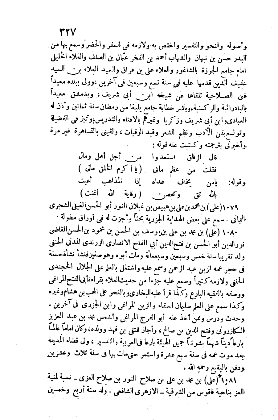 وأصوله والنحو وَالتَّفْسِير واختص بِهِ ولازمه فِي السّفر والحضر وَسمع بهَا من الْبَدْر حسن بن نَبهَان والشهاب أَحْمد بن الْفَخر عُثْمَان بن الصلف والْعَلَاء الخليلي إِمَام جَامع الجوزة بالشاغور والْعَلَاء عَليّ بن عراق وَالسَّيِّد الْعَلَاء بن السَّيِّد عفيف الدّين قدمهَا عَلَيْهِ فِي سنة تسع وَسبعين فِي آخَرين، وَولي بِبَلَدِهِ معيدا فِي الصلاحية تلقاها عَن شَيْخه ابْن أبي شرِيف، وبدمشق معيدا بالبادرائية والركنية، وباشر خطابة جَامع يلبغا من رَمَضَان سنة ثَمَانِينَ وَأذن لَهُ الْعَبَّادِيّ وَابْن أبي شرِيف وزَكَرِيا وَغَيرهم بالإفتاء والتدريس وتميز فِي الْفَضِيلَة وتولع بفن الْأَدَب ونظم الشّعْر وَقيد الوفيات، ولقيني بِالْقَاهِرَةِ غير مرّة وَأَخْبرنِي بترجمته وكتبت عَنهُ قَوْله: