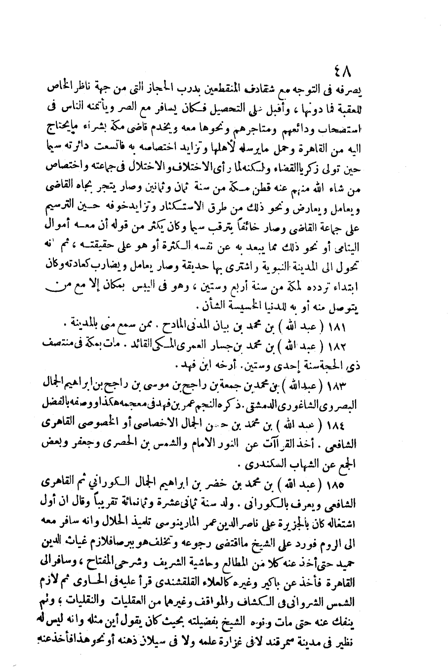 عبد الله بن مُحَمَّد بن خضر بن إِبْرَاهِيم الْجمال الكوراني ثمَّ القاهري الشَّافِعِي وَيعرف بالكوراني. ولد سنة ثَمَانِي عشرَة وَثَمَانمِائَة تَقْرِيبًا وَقَالَ أَن أول اشْتِغَاله كَانَ بالجزيرة على نَاصِر الدّين عمر المارينوسي تلميذ الْحَلَال وَأَنه سَافر مَعَه إِلَى الرّوم فورد على الشَّيْخ مَا اقْتضى رُجُوعه وتخلف هُوَ ببر صافلازم غياث الدّين حميد حَتَّى أَخذ عَنهُ كلا من الْمطَالع وحاشية الشريف وشرحي الْمِفْتَاح، وسافر إِلَى الْقَاهِرَة فَأخذ عَن باكير وَغَيره كالعلاء القلقشندي قَرَأَ عَلَيْهِ فِي الْحَاوِي ثمَّ لَازم الشَّمْس الشرواني فِي الْكَشَّاف والمواقف وَغَيرهمَا من العقليات والنقليات، وَلم يَنْفَكّ عَنهُ حَتَّى مَاتَ ونوره الشَّيْخ بفضيلته بِحَيْثُ كَانَ يَقُول أَيْن مثله وَأَنه لَيْسَ لَهُ نَظِير فِي مَدِينَة سَمَرْقَنْد لَا فِي غزارة علمه وَلَا فِي سيلان ذهنه أَو نَحْو هَذَا فَأخذ عَنهُ