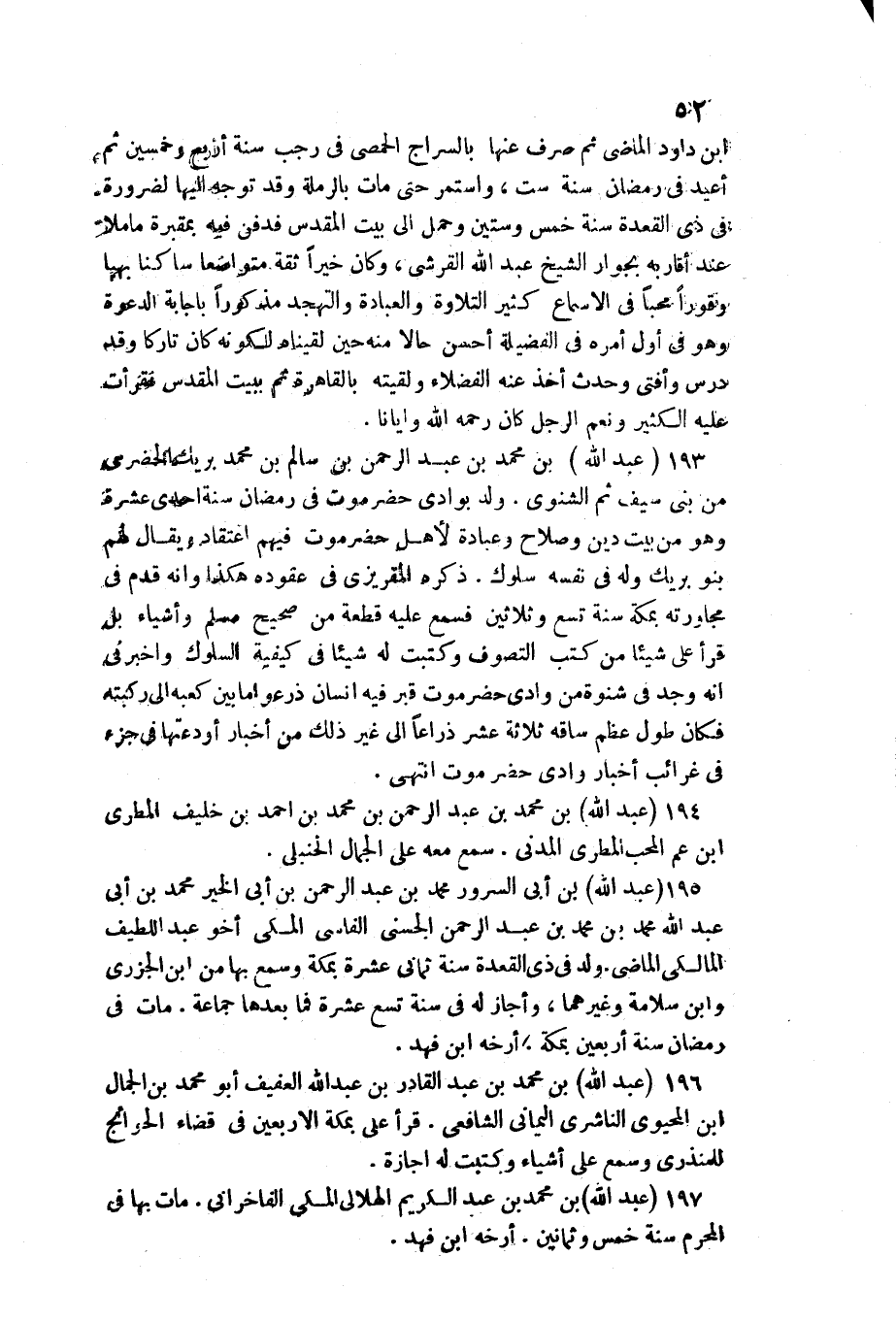 عبد الله بن عبد الرَّحْمَن بن سَالم بن مُحَمَّد بن بريك الحضري من بني سيف ثمَّ الشنوي. ولد بوادي حَضرمَوْت فِي رَمَضَان سنة إِحْدَى عشرَة وَهُوَ من بَيت دين وَصَلَاح وَعبادَة لأهل حَضرمَوْت فيهم اعْتِقَاد يُقَال لَهُم بَنو بريك وَله فِي نَفسه سلوك. ذكره المقريزي فِي عقوده هَكَذَا وَأَنه قدم فِي مجاورته بِمَكَّة سنة تسع وَثَلَاثِينَ فَسمع عَلَيْهِ قِطْعَة من صَحِيح مُسلم وَأَشْيَاء بل قَرَأَ عَليّ أَشْيَاء من كتب التصوف وكتبت لَهُ شَيْئا فِي كَيْفيَّة السلوك وَأَخْبرنِي أَنه وجد فِي شنوة من وَادي حَضرمَوْت قبر فِيهِ إِنْسَان ذرعوا مَا بَين كَعبه إِلَى رُكْبَتَيْهِ فَكَانَ طول عظم سَاقه ثَلَاثَة عشر ذِرَاعا إِلَى غير ذَلِك من أَخْبَار أودعتها فِي جُزْء فِي غرائب أَخْبَار وَادي حَضرمَوْت.)