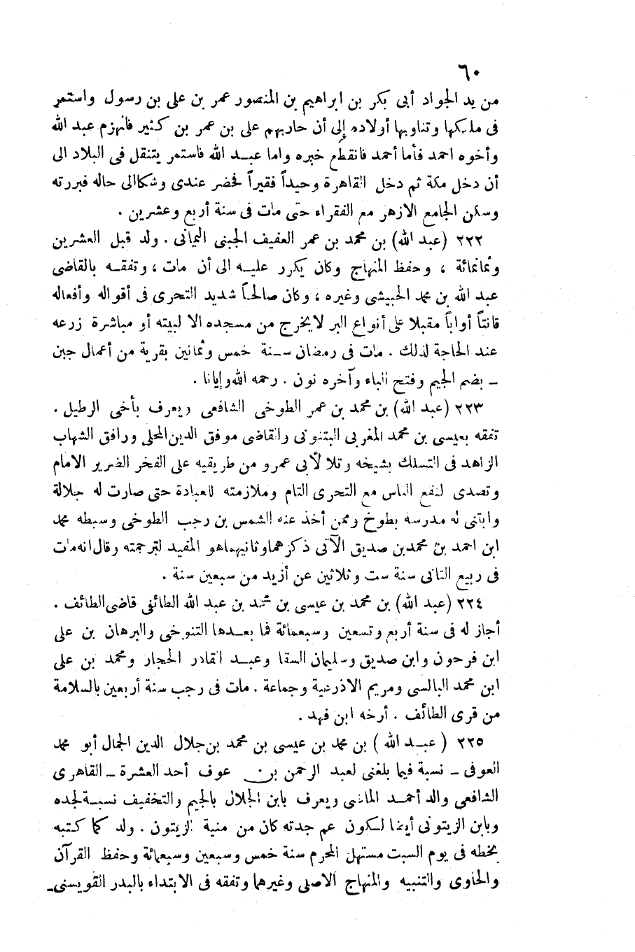 من يَد الْجواد أبي بكر بن إِبْرَاهِيم بن الْمَنْصُور عمر بن عَليّ بن رَسُول وَاسْتمرّ فِي ملكهَا وتناوبها أَوْلَاده إِلَى أَن حاربهم عَليّ بن عمر بن كثير فَانْهَزَمَ عبد الله وَأَخُوهُ أَحْمد فَأَما أَحْمد فَانْقَطع خَبره وَأما عبد الله فاستمر يتنقل فِي الْبِلَاد إِلَى أَن دخل مَكَّة ثمَّ دخل الْقَاهِرَة وحيدا فَقِيرا فَحَضَرَ عِنْدِي وشكا إِلَيّ حَاله فبررته وَسكن الْجَامِع الْأَزْهَر مَعَ الْفُقَرَاء حَتَّى مَاتَ فِي سنة أَربع وَعشْرين.