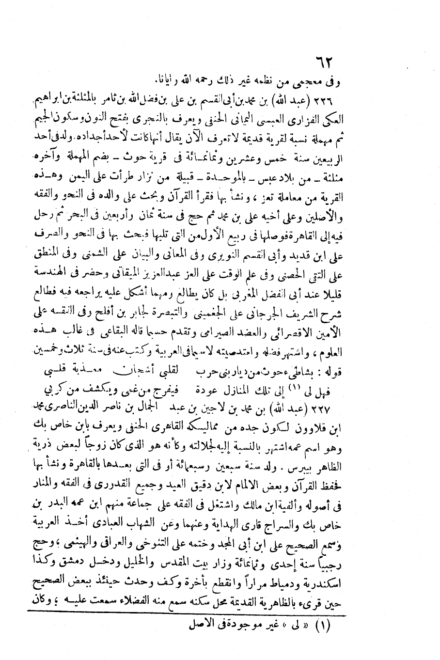 عبد الله بن مُحَمَّد بن أبي الْقسم بن عَليّ بن فضل الله بن تامر بِالْمُثَلثَةِ بن إِبْرَاهِيم العكي الْفَزارِيّ الْعَبْسِي الْيَمَانِيّ الْحَنَفِيّ وَيعرف بالنجري بِفَتْح النُّون وَسُكُون الْجِيم ثمَّ مُهْملَة نِسْبَة لقرية قديمَة لَا تعرف الْآن يُقَال أَنَّهَا كَانَت لأحد أجداده. ولد فِي أحد الربيعين سنة خمس وَعشْرين وَثَمَانمِائَة فِي قَرْيَة حوث بِضَم الْمُهْملَة وَآخره مُثَلّثَة من بِلَاد عبس بِالْمُوَحَّدَةِ قَبيلَة من نزار طرأت على الْيمن وَهَذِه الْقرْيَة من مُعَاملَة تعز، وَنَشَأ بهَا فَقَرَأَ الْقُرْآن وَبحث)