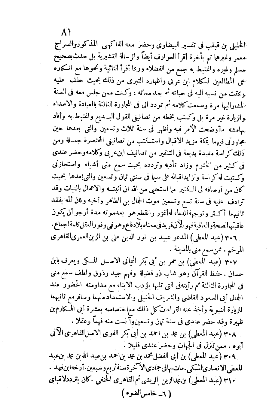 الخليلي بن قبقب فِي تَفْسِير الْبَيْضَاوِيّ وَحضر مَعَه الفاكهي الْمَذْكُور والسراج معمر وَغَيرهمَا ثمَّ بِأخرَة أَقرَأ العوارف أَيْضا والرسالة القشيرية بل حدث بِصَحِيح مُسلم وَغَيره واغتبط بِهِ جمع من الْفُضَلَاء وَرُبمَا أَقرَأ التائية وَنَحْوهَا مَعَ إِنْكَاره على المطالعين لكَلَام ابْن عَرَبِيّ وإظهاره التبري من ذَلِك بِحَيْثُ حلف عَلَيْهِ وتمقت من نسبه إِلَيْهِ فِي حَيَاته ثمَّ بعد مماته، وَكنت مِمَّن جلس مَعَه فِي السّنة الْمشَار إِلَيْهَا مرّة وَسمعت كَلَامه ثمَّ تودد إِلَيّ فِي الْمُجَاورَة الثَّالِثَة بالعيادة والإهداء والزيارة غير مرّة بل وَكتب بِخَطِّهِ من تصانيفي القَوْل البديع واغتبط بِهِ وَأفَاد بهامشه مَا أوضحت الْأَمر فِيهِ وَأظْهر فِي سنة ثَلَاث وَتِسْعين وَالَّتِي بعْدهَا حِين مجاورتي فيهمَا بِمَكَّة مزِيد الإقبال واستكتب من تصانيفي المختصرة جملَة وَمن ذَلِك كراسة مفيدة بديعة فِي التفكير من تصانيف ابْن عَرَبِيّ وَكَلَامه وَحضر عِنْدِي فِي كثير من الخنوم وَزَاد تأدبه وتردده بِحَيْثُ سمع مني أَشْيَاء واستجازني وكتبت لَهُ كراسة وتزايد إقباله على سِيمَا فِي سنتي ثَمَان وَتِسْعين وَالَّتِي بعْدهَا بِحَيْثُ كَانَ من أَوْصَافه لي الْكثير مِمَّا أستحي من الله أَن أثْبته والأعمال بِالنِّيَّاتِ وَقد ترادف عَلَيْهِ فِي سنة تسع وَتِسْعين موت الْجمال بن الطَّاهِر وأخيه وَكَانَ ألمه بفقد ثَانِيهمَا أَكثر وتوجهه للدُّعَاء لَهُ أغزر وَانْقطع هُوَ بعد مَوته مُدَّة أَرْجُو أَن يكون عَاقبَتهَا الصِّحَّة والعافية فَهُوَ)