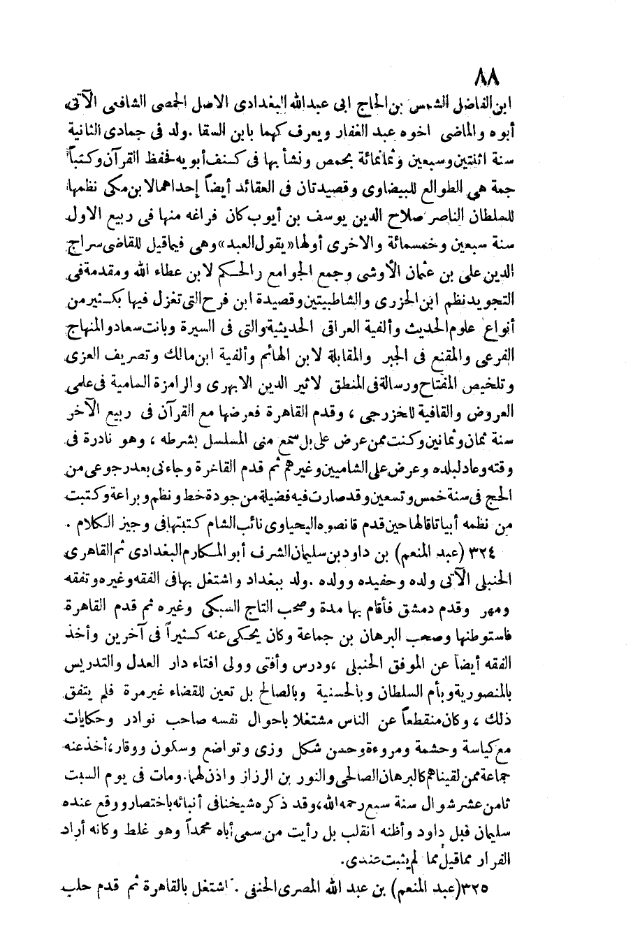بن الْفَاضِل الشَّمْس بن الْحَاج أبي عبد الله الْبَغْدَادِيّ الأَصْل الْحِمصِي الشَّافِعِي الْآتِي أَبوهُ والماضي أَخُوهُ عبد الْغفار وَيعرف كهما بِابْن السقا. ولد فِي جُمَادَى الثَّانِيَة سنة اثْنَتَيْنِ وَسبعين وَثَمَانمِائَة بحمص وَنَشَأ بهَا فِي كنف أَبَوَيْهِ فحفظ الْقُرْآن وكتبا جمة هِيَ الطوالع للبيضاوي وقصيدتان فِي العقائد أَيْضا إِحْدَاهمَا الابْن مكي نظمها سنة سبعين وَخَمْسمِائة وَالْأُخْرَى أَولهَا يَقُول العَبْد وَهِي فِيمَا قيل للْقَاضِي سراج الدّين عَليّ بن عُثْمَان الأوشي وَجمع الْجَوَامِع وَالْحكم لِابْنِ عَطاء الله ومقدمة فِي التجويد نظم ابْن الْجَزرِي والشاطبيتين وقصيدة ابْن فَرح الَّتِي تغزل فِيهَا بِكَثِير من أَنْوَاع عُلُوم الحَدِيث وألفية الْعِرَاقِيّ الحديثية وَالَّتِي فِي السِّيرَة وَبَانَتْ سعاد والمنهاج الفرعي وَالْمقنع فِي الْجَبْر والمقابلة لِابْنِ الهائم وألفية ابْن مَالك وتصريف الْعُزَّى وتلخيص الْمِفْتَاح ورسالة فِي الْمنطق لأثير الدّين الْأَبْهَرِيّ والرامزة السامية فِي علمي الْعرُوض والقافية للخزرجي، وَقدم الْقَاهِرَة فعرضها مَعَ الْقُرْآن فِي ربيع الآخر سنة ثَمَان وَثَمَانِينَ وَكنت مِمَّن عرض عَليّ بل سمع مني المسلسل بِشَرْطِهِ، وَهُوَ نادرة فِي وقته وَعَاد لبلده وَعرض على الشاميين وَغَيرهم ثمَّ قدم الْقَاهِرَة وَجَاءَنِي بعد رجوعي من الْحَج فِي سنة خمس وَتِسْعين وَقد صَارَت فِيهِ فَضِيلَة من جودة خطّ ونظم وبراعة وكتبت من نظمه أبياتا قَالَهَا حِين قدم قانصوه اليحياوي نَائِب الشَّام كتبتها فِي وجيز الْكَلَام.