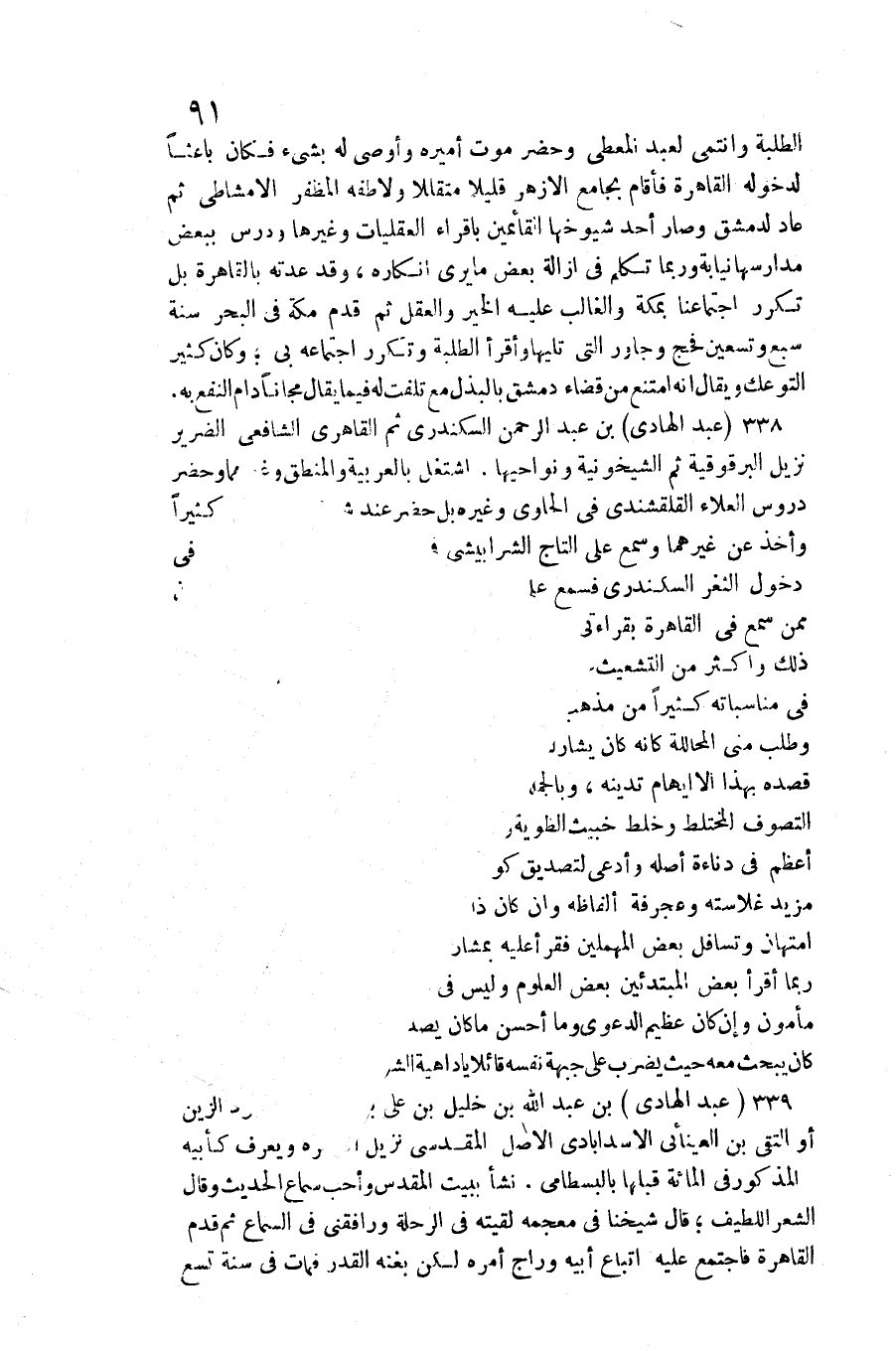 عبد الْهَادِي بن عبد الرَّحْمَن السكندري ثمَّ القاهري الشَّافِعِي الضَّرِير نزيل البرقوقية ثمَّ الشيخونية ونواحيها. اشْتغل بِالْعَرَبِيَّةِ والمنطق وَغَيرهمَا وَحضر دروس الْعَلَاء القلقشندي فِي الْحَاوِي وَغَيره بل حضر عِنْد شَيخنَا ولازمهما كثيرا وَأخذ عَن غَيرهمَا وَسمع على التَّاج الشرابيشي فِي سنة سبع وَثَلَاثِينَ ورافقني فِي دُخُول الثغر السكندري فَسمع على بعض الشُّيُوخ بهَا وبقوة وَغَيرهمَا بل كَانَ مِمَّن سمع فِي الْقَاهِرَة بِقِرَاءَتِي على شَيخنَا وَغَيره ثمَّ اخْتصَّ بالبقاعي وتنافرا بعد ذَلِك وَأكْثر من التشعيث عَلَيْهِ وَلزِمَ حِينَئِذٍ الأبناسي وَصَارَ يَقُول أَنه أَدخل عَلَيْهِ فِي مناسباته كثيرا من مَذْهَب ابْن عَرَبِيّ لعدم شعوره بفهم مَعْنَاهُ وَجَاءَنِي حِينَئِذٍ وَطلب مني المحاللة كَأَنَّهُ كَانَ يُشَارك البقاعي فِيمَا هُوَ دأبه وديدنه مَعَ النَّاس وَلَيْسَ قَصده بِهَذَا إِلَّا إِيهَام تدينه، وَبِالْجُمْلَةِ فَهُوَ مِمَّن فهم وتميز فِي العقليات وَنظر فِي التصوف الْمُخْتَلط وخلط خَبِيث الطوية والسريرة مِمَّن دَعَا لِابْنِ عَرَبِيّ وَنَحْوه وَذَلِكَ أعظم فِي دناءة أَصله وأدعى)