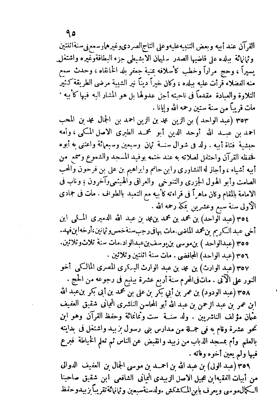 عبد الْوَاحِد بن الزين مُحَمَّد بن الزين أَحْمد بن الْجمال مُحَمَّد بن الْمُحب أَحْمد بن عبد الله أوحد الدّين أَبُو مُحَمَّد الطَّبَرِيّ الأَصْل الْمَكِّيّ، وَأمه حبشية فتاة أَبِيه. ولد فِي شَوَّال سنة ثَمَان وَسبعين وَسَبْعمائة واعتنى بِهِ أَبوهُ فحفظه الْقُرْآن واحتفل لصلاته بِهِ عِنْد خَتمه بوقيد الْمَسْجِد والشموع)