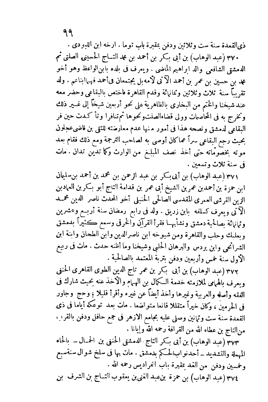 عبد الْوَهَّاب بن أبي بكر بن عبد الرَّحْمَن بن مُحَمَّد بن أَحْمد بن سُلَيْمَان بن حَمْزَة ابْن أَحْمد بن عمر بن الشَّيْخ أبي عمر بن قدامَة التَّاج أَبُو بكر بن العمادين الزين الْقرشِي الْعمريّ الْمَقْدِسِي الصَّالِحِي الْحَنْبَلِيّ أَخُو الْمُحدث نَاصِر الدّين مُحَمَّد الْآتِي وَيعرف كسلفه بِابْن زُرَيْق. ولد فِي رَابِع رَمَضَان سنة أَربع وَعشْرين وَثَمَانمِائَة بصالحية دمشق وَنَشَأ بهَا فَقَرَأَ الْقُرْآن والخرقي وَسمع كثيرا بِدِمَشْق وبعلبك وحلب والقاهرة وَمن شُيُوخه ابْن نَاصِر الدّين وَابْن الطَّحَّان وَابْنَة ابْن الشرايحي وَابْن بردس والبرهان الْحلَبِي وَشَيخنَا وَمَا أَظُنهُ حدث. مَاتَ فِي ربيع الأول سنة خمس وَأَرْبَعين وَدفن بتربة الْمُعْتَمد بالصالحية.