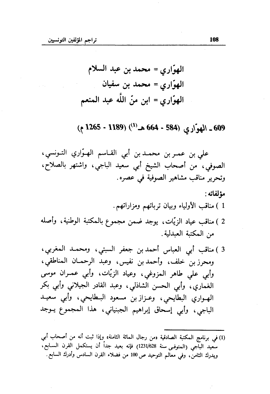 (¬1) في برنامج المكتبة الصادقية «من رجال المائة الثامنة» وإذا ثبت أنه من أصحاب أبي سعيد الباجي (المتوفى سنة 628/ 1231) فإنه بعيد جدا أن يستكمل القرن السابع، ويدرك الثامن، وفي معالم التوحيد ص 100 من فضلاء القرن السادس وأدرك السابع.