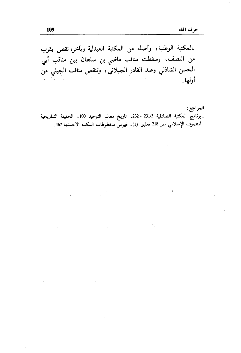 بالمكتبة الوطنية، وأصله من المكتبة العبدلية وبآخره نقص يقرب من النصف، وسقطت مناقب ماضي بن سلطان بين مناقب أبي الحسن الشاذلي وعبد القادر الجيلاني، وتنقص مناقب الجيلي من أولها.