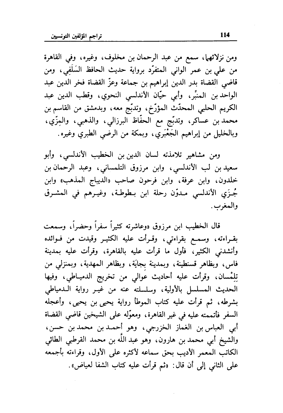 قال الخطيب ابن مرزوق «وعاشرته كثيرا سفرا وحضرا، وسمعت بقراءته، وسمع بقراءتي، وقرأت عليه الكثير وقيدت من فوائده وأنشدني الكثير، فأول ما قرأت عليه بالقاهرة، وقرأت عليه بمدينة فاس، وبظاهر قسنطينة، وبمدينة بجاية، وبظاهر المهدية، وبمنزلي من تلمسان، وقرأت عليه أحاديث عوالي من تخريج الدمياطي، وفيها الحديث المسلسل بالأولية، وسلسلته عنه من غير رواية الدمياطي بشرطه، ثم قرأت عليه كتاب الموطأ رواية يحيى بن يحيى، وأعجله السفر فأتممته عليه في غير القاهرة، ومعوّله على الشيخين قاضي القضاة أبي العباس بن الغماز الخزرجي، وهو أحمد بن محمد بن حسن، والشيخ أبي محمد بن هارون، وهو عبد الله بن محمد القرطبي الطائي الكاتب المعمر الأديب بحق سماعه لأكثره على الأول، وقراءته بأجمعه على الثاني إلى أن قال: «ثم قرأت عليه كتاب الشفا لعياض».