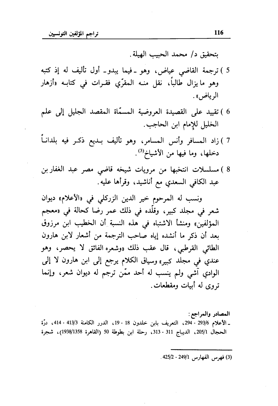 5) ترجمة القاضي عياض، وهو - فيما يبدو - أول تأليف له إذ كتبه وهو ما يزال طالبا، نقل منه المقرّي فقرات في كتابه «أزهار الرياض».