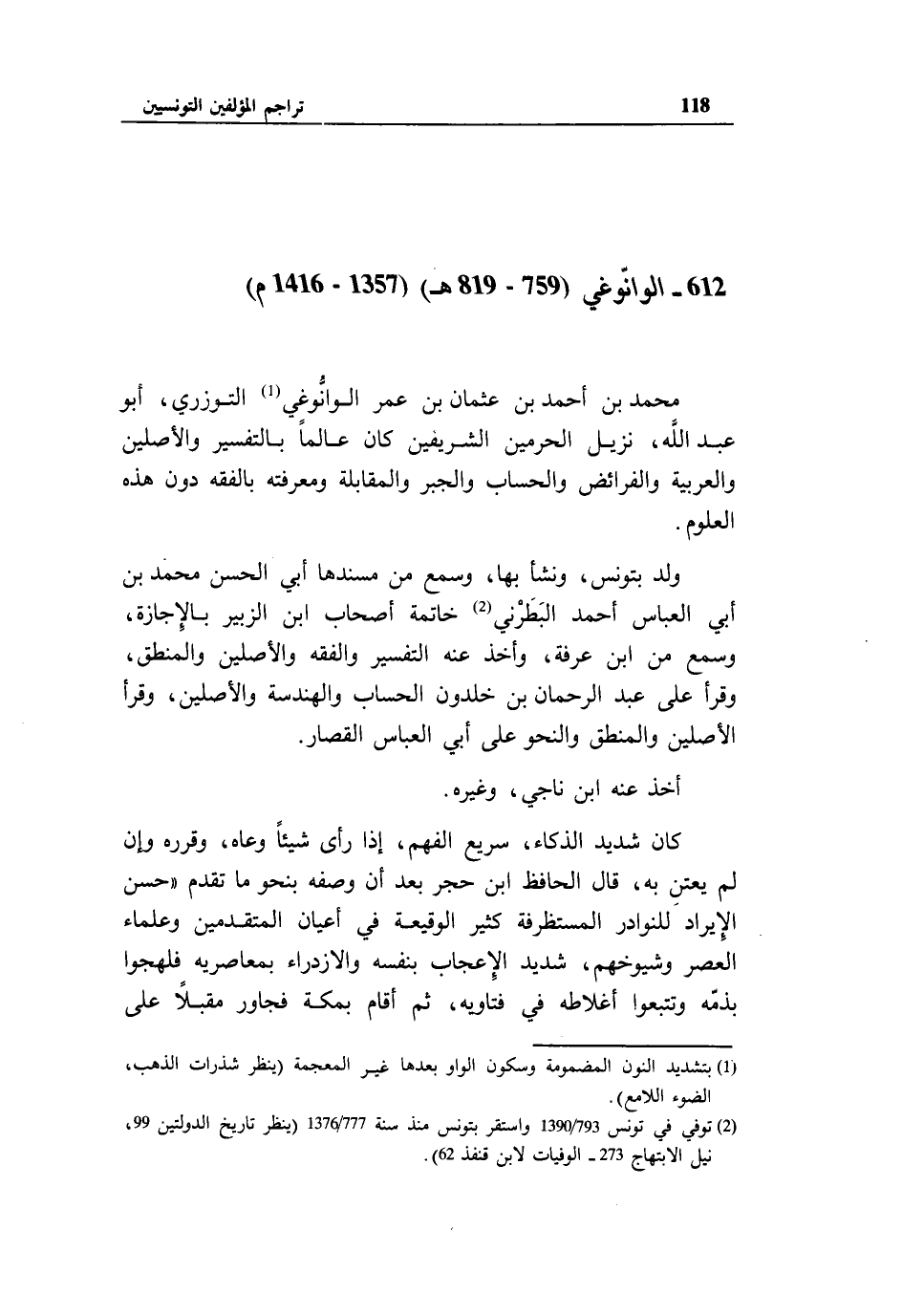 (¬2) توفي في تونس 793/ 1390 واستقر بتونس منذ سنة 777/ 1376 (ينظر تاريخ الدولتين 99، نيل الابتهاج 273 - الوفيات لابن قنفذ 62).