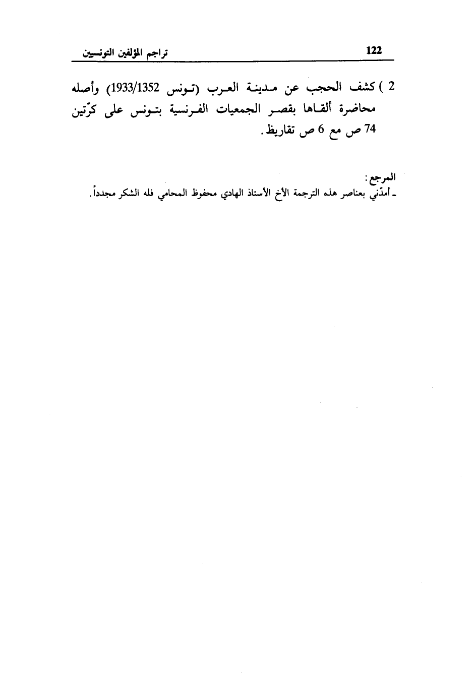 2) كشف الحجب عن مدينة العرب (تونس 1352/ 1933) وأصله محاضرة ألقاها بقصر الجمعيات الفرنسية بتونس على كرّتين 74 ص مع 6 ص تقاريظ.