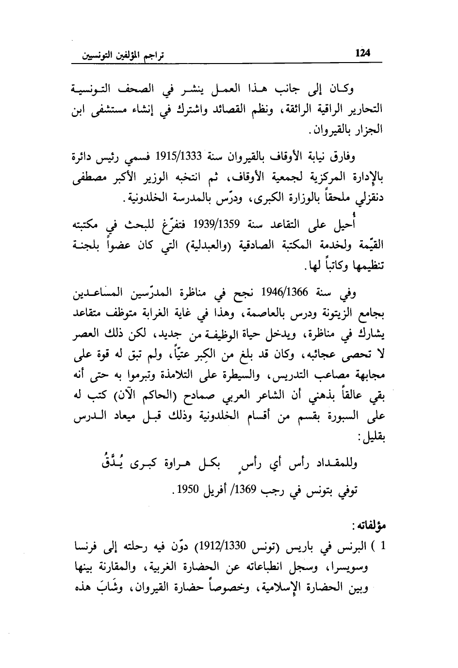 أحيل على التقاعد سنة 1359/ 1939 فتفرّغ للبحث في مكتبته القيّمة ولخدمة المكتبة الصادقية (والعبدلية) التي كان عضوا بلجنة تنظيمها وكاتبا لها.