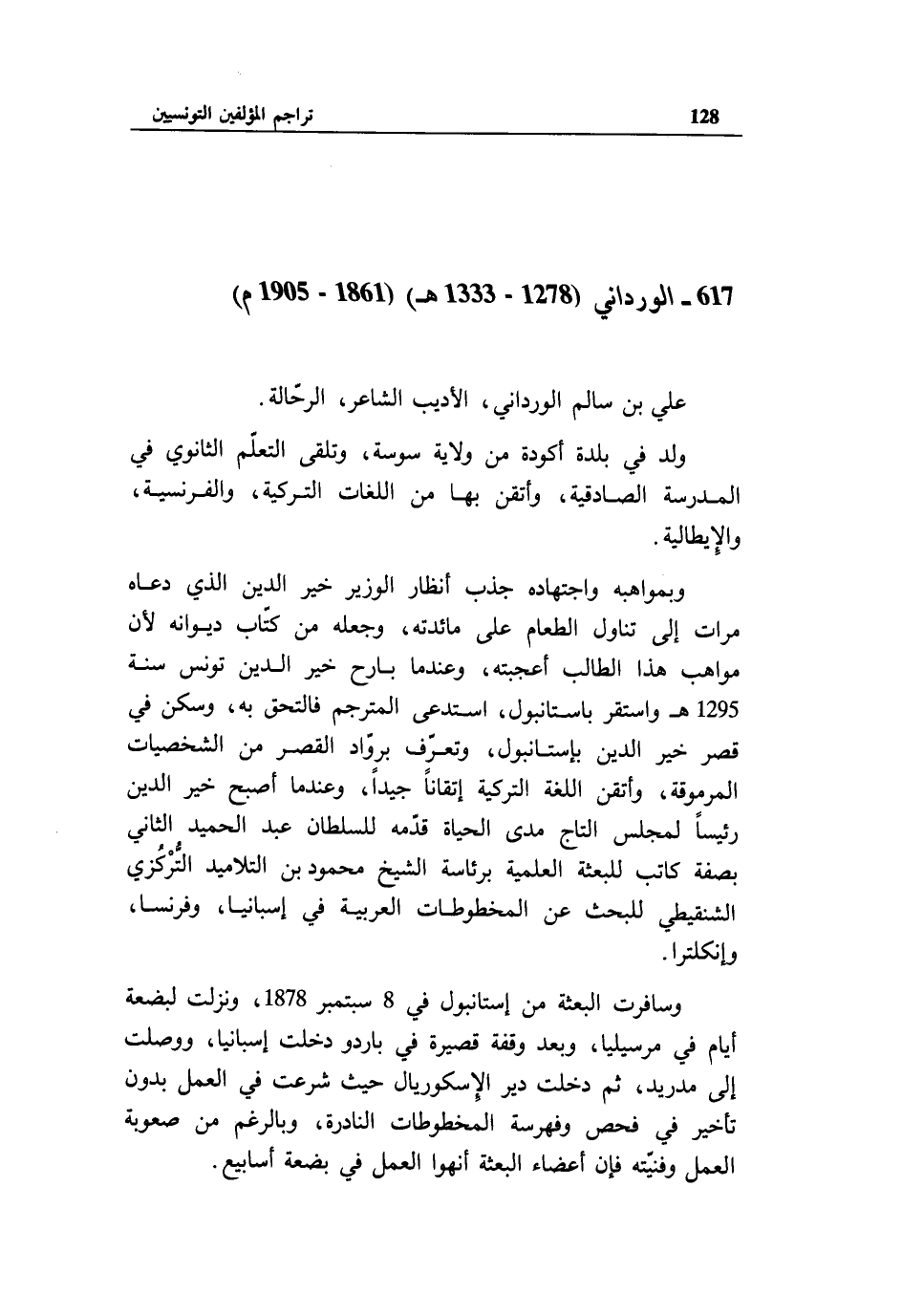 وسافرت البعثة من إستانبول في 8 سبتمبر 1878، ونزلت لبضعة أيام في مرسيليا، وبعد وقفة قصيرة في باردو دخلت إسبانيا، ووصلت إلى مدريد، ثم دخلت دير الإسكوريال حيث شرعت في العمل بدون تأخير في فحص وفهرسة المخطوطات النادرة، وبالرغم من صعوبة العمل وفنيّته فإن أعضاء البعثة أنهوا العمل في بضعة أسابيع.