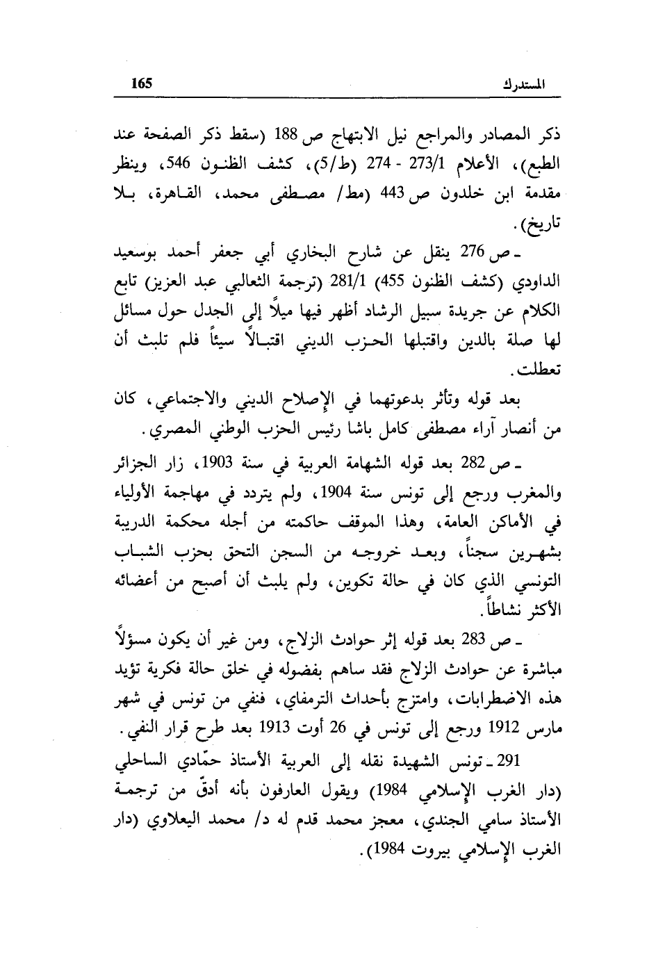 - ص 283 بعد قوله إثر حوادث الزلاج، ومن غير أن يكون مسئولا مباشرة عن حوادث الزلاج فقد ساهم بفضوله في خلق حالة فكرية تؤيد هذه الاضطرابات، وامتزج بأحداث الترمفاي، فنفي من تونس في شهر مارس 1912 ورجع إلى تونس في 26 أوت 1913 بعد طرح قرار النفي.