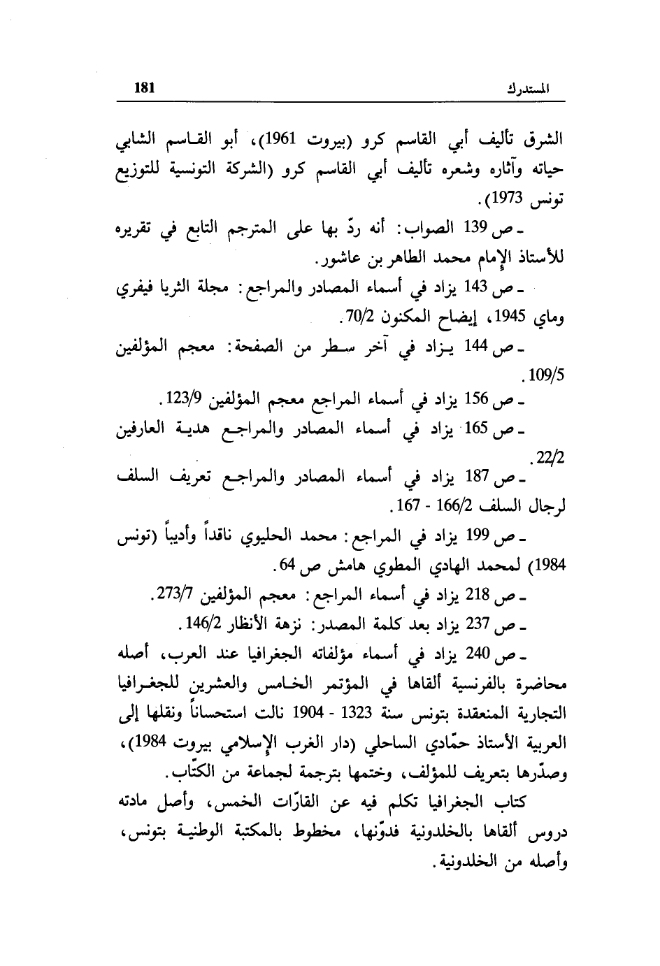 - ص 143 يزاد في أسماء المصادر والمراجع: مجلة الثريا فيفري وماي 1945، إيضاح المكنون 2/ 70.