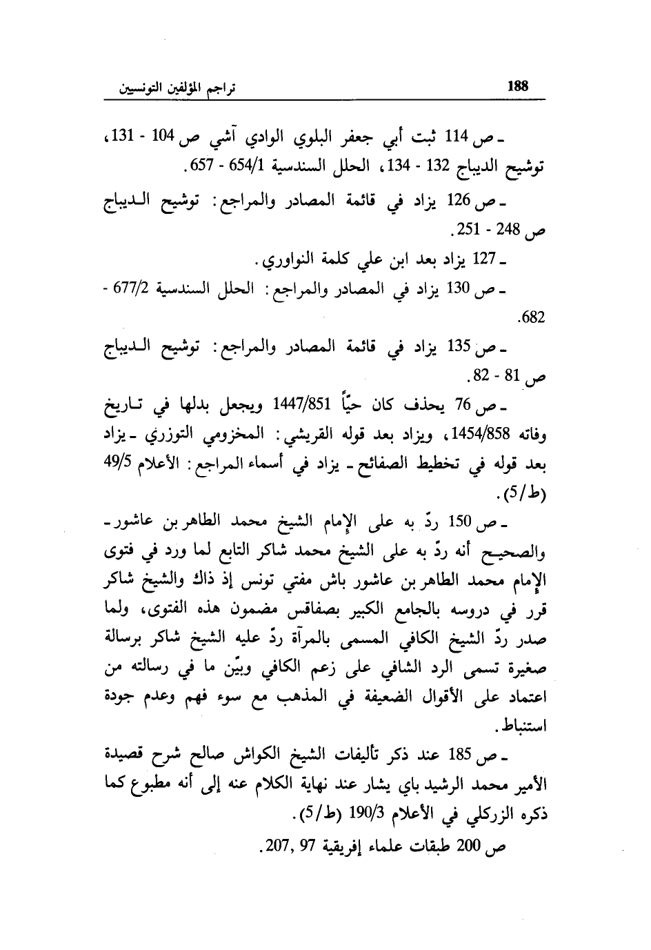 - ص 185 عند ذكر تأليفات الشيخ الكواش صالح شرح قصيدة الأمير محمد الرشيد باي يشار عند نهاية الكلام عنه إلى أنه مطبوع كما ذكره الزركلي في الأعلام 3/ 190 (ط 5/).