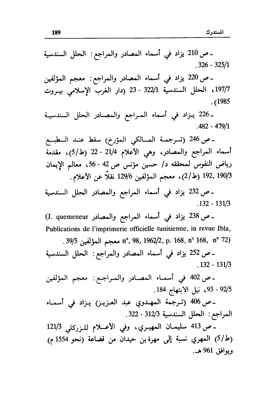 - ص 238 يزاد في أسماء المراجع والمصادر J.quemeneur Publications de I'imprimerie officielle tunisienne، in revue Ibla، n، 98، 2 / 1962، p.168، n 168، n 72 معجم المؤلفين 5/ 39.