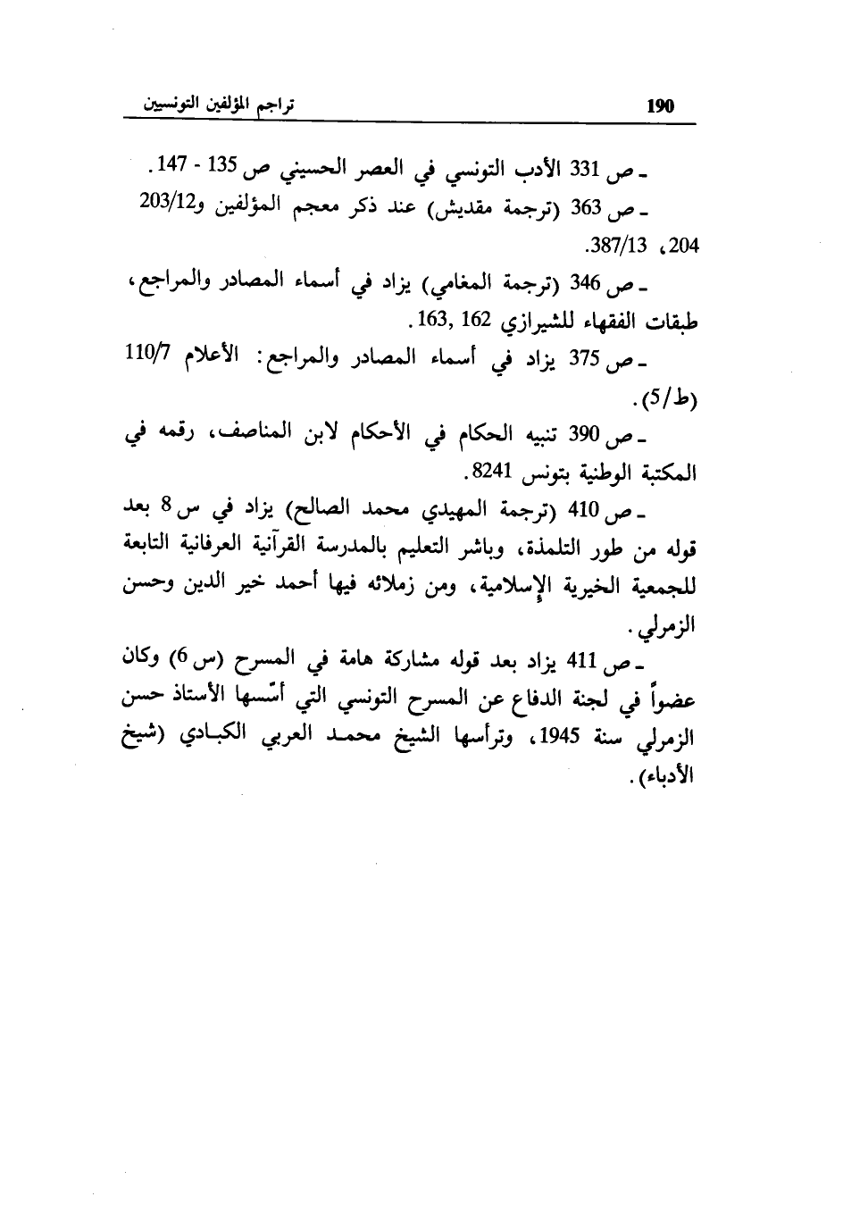 - ص 411 يزاد بعد قوله مشاركة هامة في المسرح (س 6) وكان عضوا في لجنة الدفاع عن المسرح التونسي التي أسّسها الأستاذ حسن الزمرلي سنة 1945، وترأسها الشيخ محمد العربي الكبادي (شيخ الأدباء).