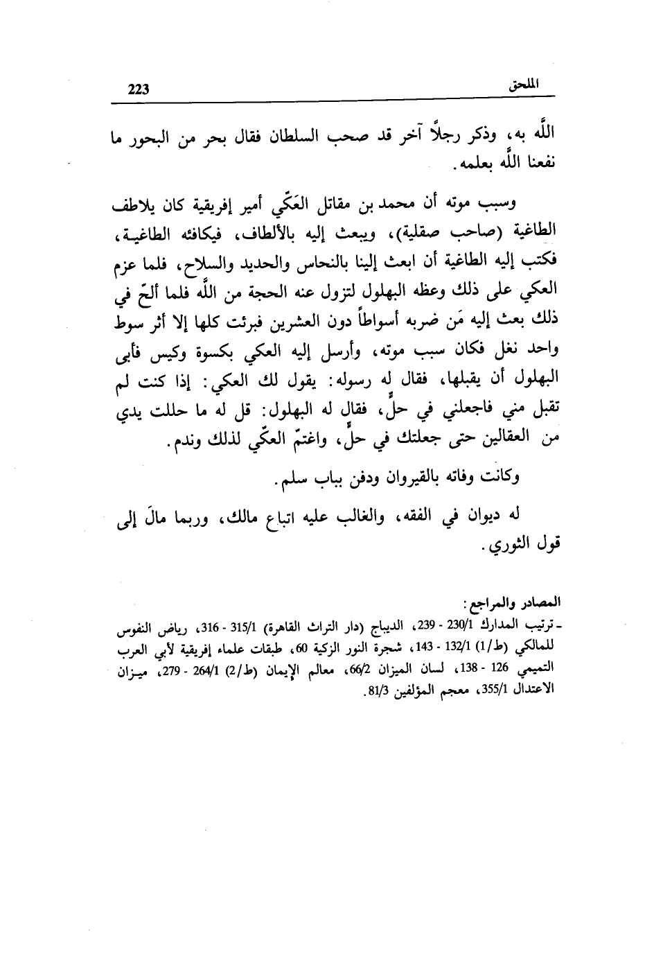 - ترتيب المدارك 1/ 230 - 239، الديباج (دار التراث القاهرة) 1/ 315 - 316، رياض النفوس للمالكي (ط 1/) 1/ 132 - 143، شجرة النور الزكية 60، طبقات علماء إفريقية لأبي العرب التميمي 126 - 138، لسان الميزان 2/ 66، معالم الإيمان (ط 2/) 1/ 264 - 279، ميزان الاعتدال 1/ 355، معجم المؤلفين 3/ 81.