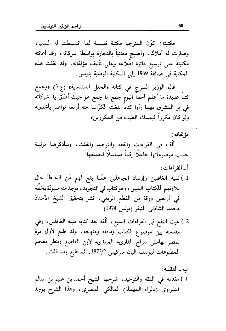 1) تنبيه الغافلين وإرشاد الجاهلين عمّا يقع لهم من الخطأ حال تلاوتهم للكتاب المبين، وهو كتاب في التجويد، توجد منه مسودّة بخطّه في أربعين ورقة من القطع الربعي، نشر بتحقيق الشيخ الأستاذ محمد الشاذلي النيفر (تونس 1974).