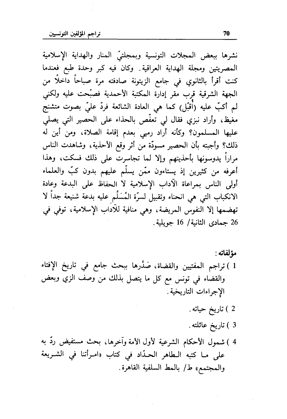 نشرها ببعض المجلات التونسية وبمجلتيّ المنار والهداية الإسلامية المصريتين ومجلة الهداية العراقية. وكان فيه كبر وحدة طبع فعند ما كنت أقرأ بالثانوي في جامع الزيتونة صادفته مرة صباحا داخلا من الجهة الشرقية قرب مقر إدارة المكتبة الأحمدية فصبّحت عليه ولكني لم أكبّ عليه (أقبّل) كما هي العادة الشائعة فردّ عليّ بصوت متشنج مغيظ، وأراد نبزي فقال لي تعفّص بالحذاء على الحصير التي يصلي عليها المسلمون؟ وكأنه أراد رميي بعدم إقامة الصلاة، ومن أين له ذلك؟ وأجبته بأن الحصير مسودّة من أثر وقع الأحذية، وشاهدت الناس مرارا يدوسونها بأحذيتهم وإلا لما تجاسرت على ذلك فسكت، وهذا أعرفه من كثيرين إذ يستاءون ممّن يسلّم عليهم بدون كبّ والعلماء أولى الناس بمراعاة الآداب الإسلامية لا الحفاظ على البدعة وعادة الانكباب التي هي انحناء وتقبيل لسرّة المسلّم عليه بدعة شنيعة جدا لا تهضمها إلا النفوس المريضة، وهي منافية للآداب الإسلامية، توفي في 26 جمادى الثانية 16/ جويلية.