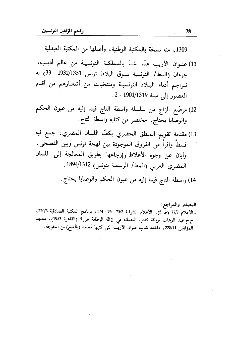 11) عنوان الأريب عمّا نشأ بالمملكة التونسية من عالم أديب، جزءان (المط/التونسية بسوق البلاط تونس 1351/ 1932 - 33) به تراجم أدباء البلاد التونسية ومنتخبات من أشعارهم من أقدم العصور إلى سنة 1319/ 1901 - 2.