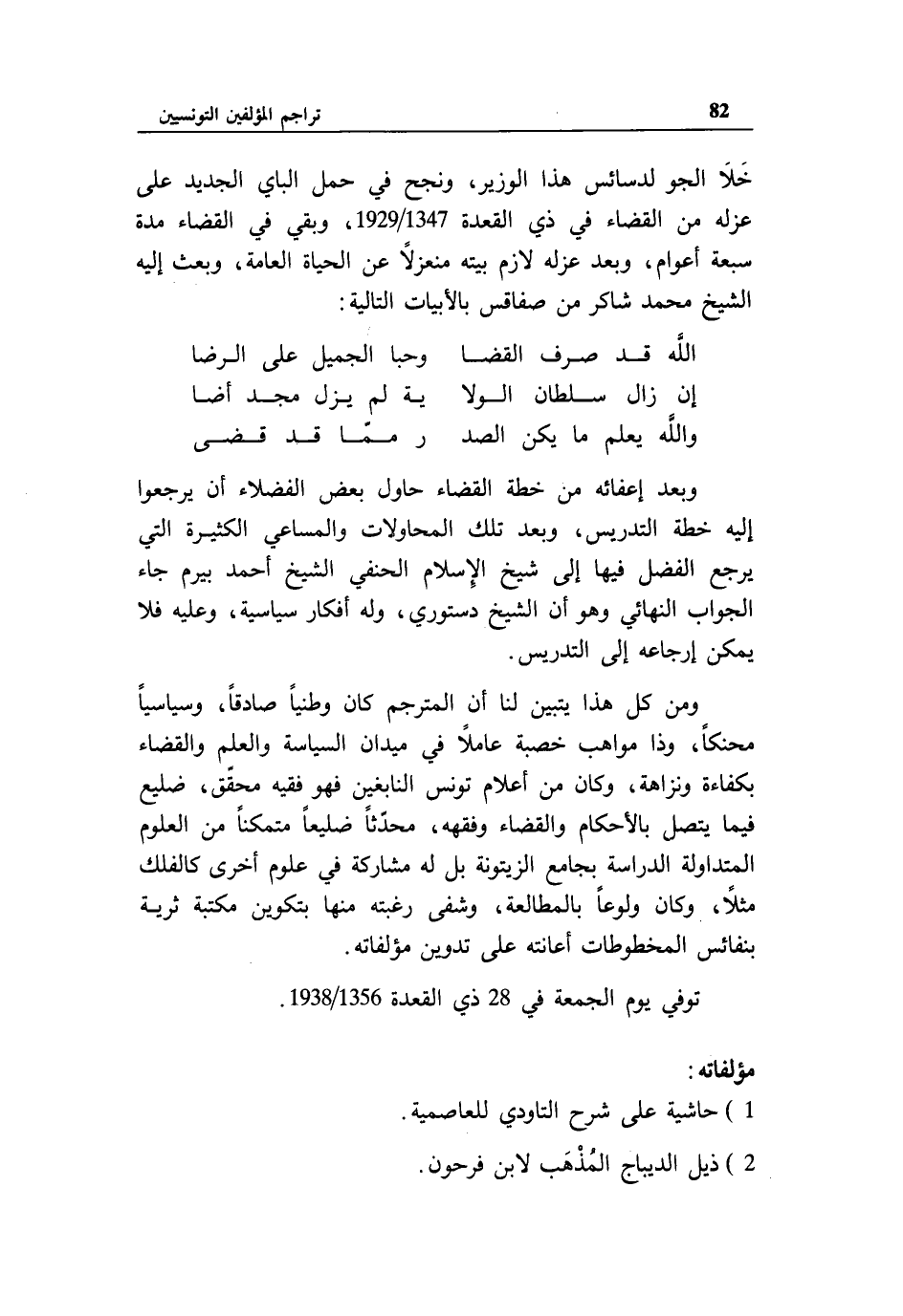 خلا الجو لدسائس هذا الوزير، ونجح في حمل الباي الجديد على عزله من القضاء في ذي القعدة 1347/ 1929، وبقي في القضاء مدة سبعة أعوام، وبعد عزله لازم بيته منعزلا عن الحياة العامة، وبعث إليه الشيخ محمد شاكر من صفاقس بالأبيات التالية: