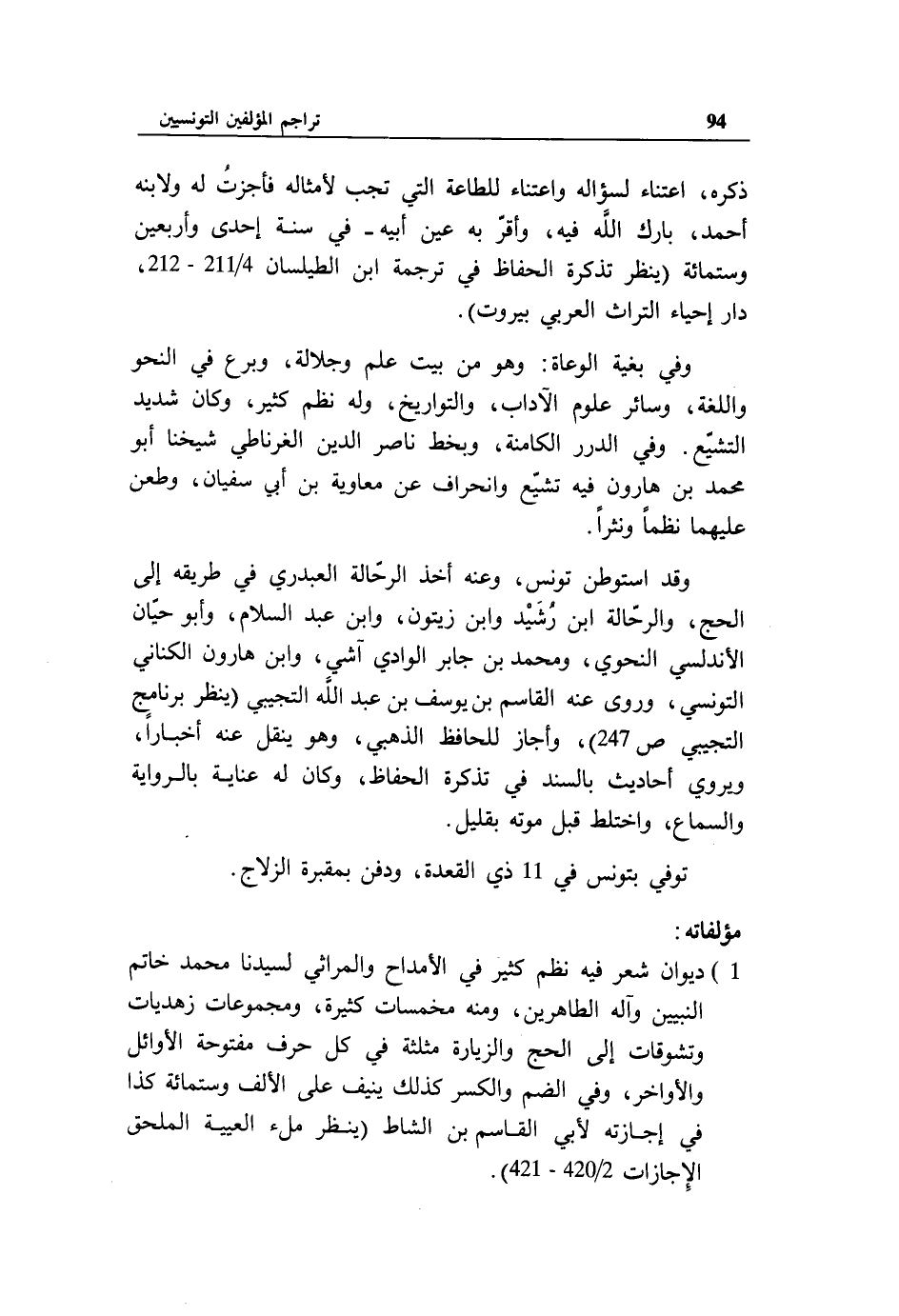 ذكره، اعتناء لسؤاله واعتناء للطاعة التي تجب لأمثاله فأجزت له ولابنه أحمد، بارك الله فيه، وأقرّ به عين أبيه - في سنة إحدى وأربعين وستمائة (ينظر تذكرة الحفاظ في ترجمة ابن الطيلسان 4/ 211 - 212، دار إحياء التراث العربي بيروت).
