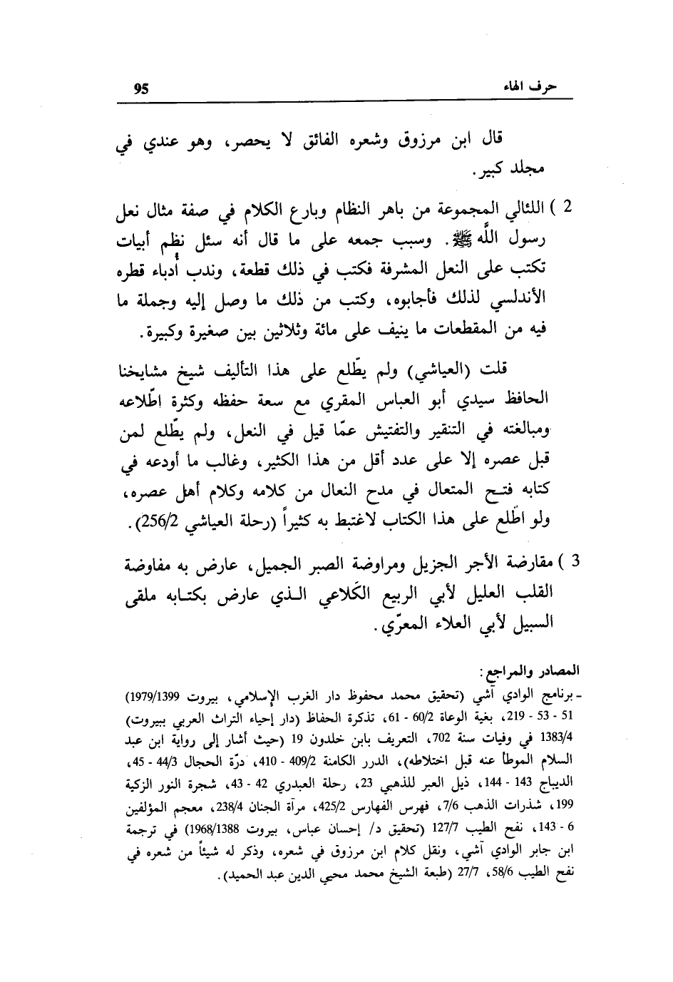 قلت (العياشي) ولم يطّلع على هذا التأليف شيخ مشايخنا الحافظ سيدي أبو العباس المقري مع سعة حفظه وكثرة اطّلاعه ومبالغته في التنقير والتفتيش عمّا قيل في النعل، ولم يطّلع لمن قبل عصره إلا على عدد أقل من هذا الكثير، وغالب ما أودعه في كتابه فتح المتعال في مدح النعال من كلامه وكلام أهل عصره، ولو اطّلع على هذا الكتاب لاغتبط به كثيرا (رحلة العياشي 2/ 256).