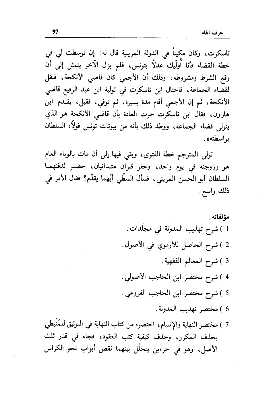 تاسكرت، وكان مكينا في الدولة المرينية قال له: إن توسطت لي في خطة القضاء فأنا أولّيك عدلا بتونس، فلم يزل الآخر يتمثل إلى أن وقع الشرط ومشروطه، وذلك أن الأجمي كان قاضي الأنكحة، فنقل لقضاء الجماعة، فاحتال ابن تاسكرت في تولية ابن عبد الرفيع قاضي الأنكحة، ثم إن الأجمي أقام مدة يسيرة، ثم توفي، فقيل، يقدم ابن هارون، فقال ابن تاسكرت جرت العادة بأن قاضي الأنكحة هو الذي يتولى قضاء الجماعة، ووطد ذلك بأنه من بيوتات تونس فولاّه السلطان بواسطته».