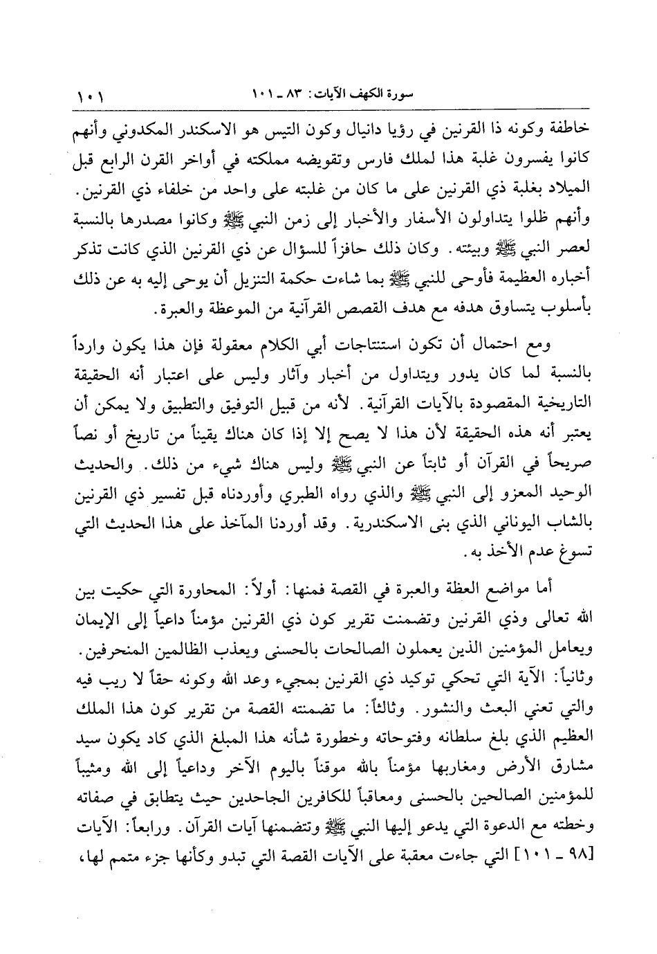 وثانيا: الآية التي تحكي توكيد ذي القرنين بمجيء وعد الله وكونه حقا لا ريب فيه والتي تعني البعث والنشور. وثالثا: ما تضمنته القصة من تقرير كون هذا الملك العظيم الذي بلغ سلطانه وفتوحاته وخطورة شأنه هذا المبلغ الذي كاد يكون سيد مشارق الأرض ومغاربها مؤمنا بالله موقنا باليوم الآخر وداعيا إلى الله ومثيبا للمؤمنين الصالحين بالحسنى ومعاقبا للكافرين الجاحدين حيث يتطابق في صفاته وخطته مع الدعوة التي يدعو إليها النبي صلى الله عليه وسلم وتتضمنها آيات القرآن. ورابعا: الآيات [98- 101] التي جاءت معقبة على الآيات القصة التي تبدو وكأنها جزء متمم لها،