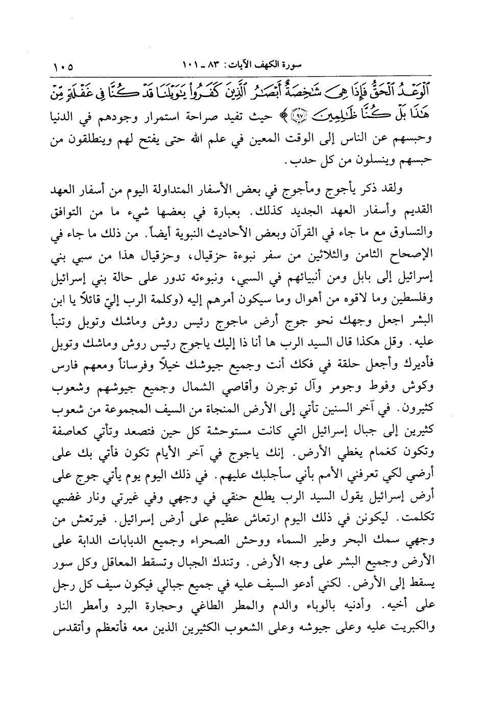 ولقد ذكر يأجوج ومأجوج في بعض الأسفار المتداولة اليوم من أسفار العهد القديم وأسفار العهد الجديد كذلك. بعبارة في بعضها شيء ما من التوافق والتساوق مع ما جاء في القرآن وبعض الأحاديث النبوية أيضا. من ذلك ما جاء في الإصحاح الثامن والثلاثين من سفر نبوءة حزقيال، وحزقيال هذا من سبي بني إسرائيل إلى بابل ومن أنبيائهم في السبي، ونبوءته تدور على حالة بني إسرائيل وفلسطين وما لا قوه من أهوال وما سيكون أمرهم إليه (وكلمة الرب إليّ قائلا يا ابن البشر اجعل وجهك نحو جوج أرض ماجوج رئيس روش وماشك وتوبل وتنبأ عليه. وقل هكذا قال السيد الرب ها أنا ذا إليك يأجوج رئيس روش وماشك وتوبل فأديرك وأجعل حلقة في فكك أنت وجميع جيوشك خيلا وفرسانا ومعهم فارس وكوش وفوط وجومر وآل توجرن وأقاصي الشمال وجميع جيوشهم وشعوب كثيرون. في آخر السنين تأتي إلى الأرض المنجاة من السيف المجموعة من شعوب كثيرين إلى جبال إسرائيل التي كانت مستوحشة كل حين فتصعد وتأتي كعاصفة وتكون كغمام يغطي الأرض. إنك يأجوج في آخر الأيام تكون فأتي بك على أرضي لكي تعرفني الأمم بأني سأجلبك عليهم. في ذلك اليوم يوم يأتي جوج على أرض إسرائيل يقول السيد الرب يطلع حنقي في وجهي وفي غيرتي ونار غضبي تكلمت. ليكونن في ذلك اليوم ارتعاش عظيم على أرض إسرائيل. فيرتعش من وجهي سمك البحر وطير السماء ووحش الصحراء وجميع الدبابات الدابة على الأرض وجميع البشر على وجه الأرض. وتندك الجبال وتسقط المعاقل وكل سور يسقط إلى الأرض. لكني أدعو السيف عليه في جميع جبالي فيكون سيف كل رجل على أخيه. وأدنيه بالوباء والدم والمطر الطاغي وحجارة البرد وأمطر النار والكبريت عليه وعلى جيوشه وعلى الشعوب الكثيرين الذين معه فأتعظم وأتقدس