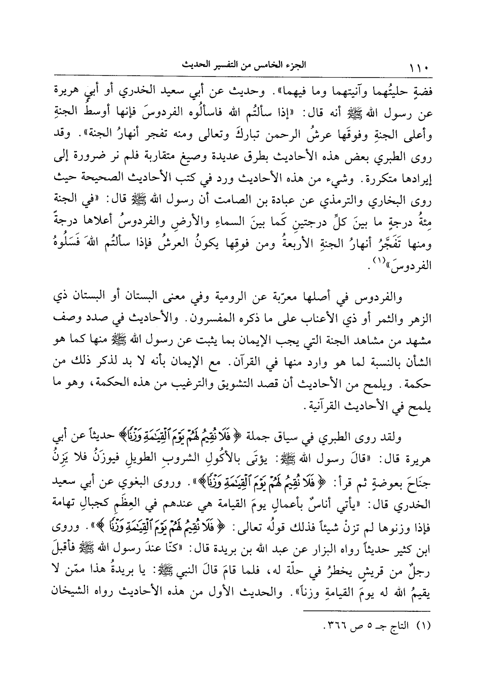 والفردوس في أصلها معرّبة عن الرومية وفي معنى البستان أو البستان ذي الزهر والثمر أو ذي الأعناب على ما ذكره المفسرون. والأحاديث في صدد وصف مشهد من مشاهد الجنة التي يجب الإيمان بما يثبت عن رسول الله صلى الله عليه وسلم منها كما هو الشأن بالنسبة لما هو وارد منها في القرآن. مع الإيمان بأنه لا بد لذكر ذلك من حكمة. ويلمح من الأحاديث أن قصد التشويق والترغيب من هذه الحكمة، وهو ما يلمح في الأحاديث القرآنية.