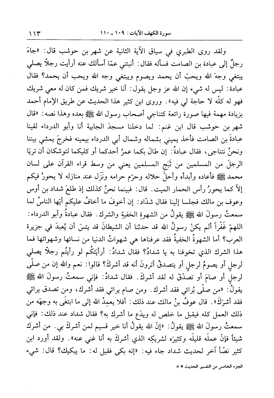 ولقد روى الطبري في سياق الآية الثانية عن شهر بن حوشب قال: «جاء رجل إلى عبادة بن الصامت فسأله فقال: أنبئني عمّا أسألك عنه أرأيت رجلا يصلي يبتغي وجه الله ويحبّ أن يحمد ويصوم ويبتغي وجه الله ويحب أن يحمد؟ فقال عبادة: ليس له شيء إن الله عز وجل يقول: أنا خير شريك فمن كان له معي شريك فهو له كلّه لا حاجة لي فيه» . وروى ابن كثير هذا الحديث عن طريق الإمام أحمد بزيادة مهمة فيها صورة رائعة كتناجي أصحاب رسول الله صلى الله عليه وسلم بعده وهذا نصه: «قال شهر بن حوشب قال ابن غنم: لما دخلنا مسجد الجابية أنا وأبو الدرداء لقينا عبادة بن الصامت فأخذ يميني بشماله وشمال أبي الدرداء بيمينه فخرج يمشي بيننا ونحن نتناجى، فقال عبادة: إن طال بكما عمر أحدكما أو كليكما لتوشكان أن تريا الرجل من المسلمين من ثبج المسلمين يعني من وسط قراء القرآن على لسان محمد صلى الله عليه وسلم فأعاده وأبدأه وأحلّ حلاله وحرّم حرامه ونزل عند منازله لا يحور فيكم إلّا كما يحور رأس الحمار الميت. قال: فبينما نحن كذلك إذ طلع شداد بن أوس وعوف بن مالك فجلسا إلينا فقال شدّاد: إن أخوف ما أخاف عليكم أيّها الناس لما سمعت رسول الله صلى الله عليه وسلم يقول من الشهوة الخفية والشرك. فقال عبادة وأبو الدرداء: