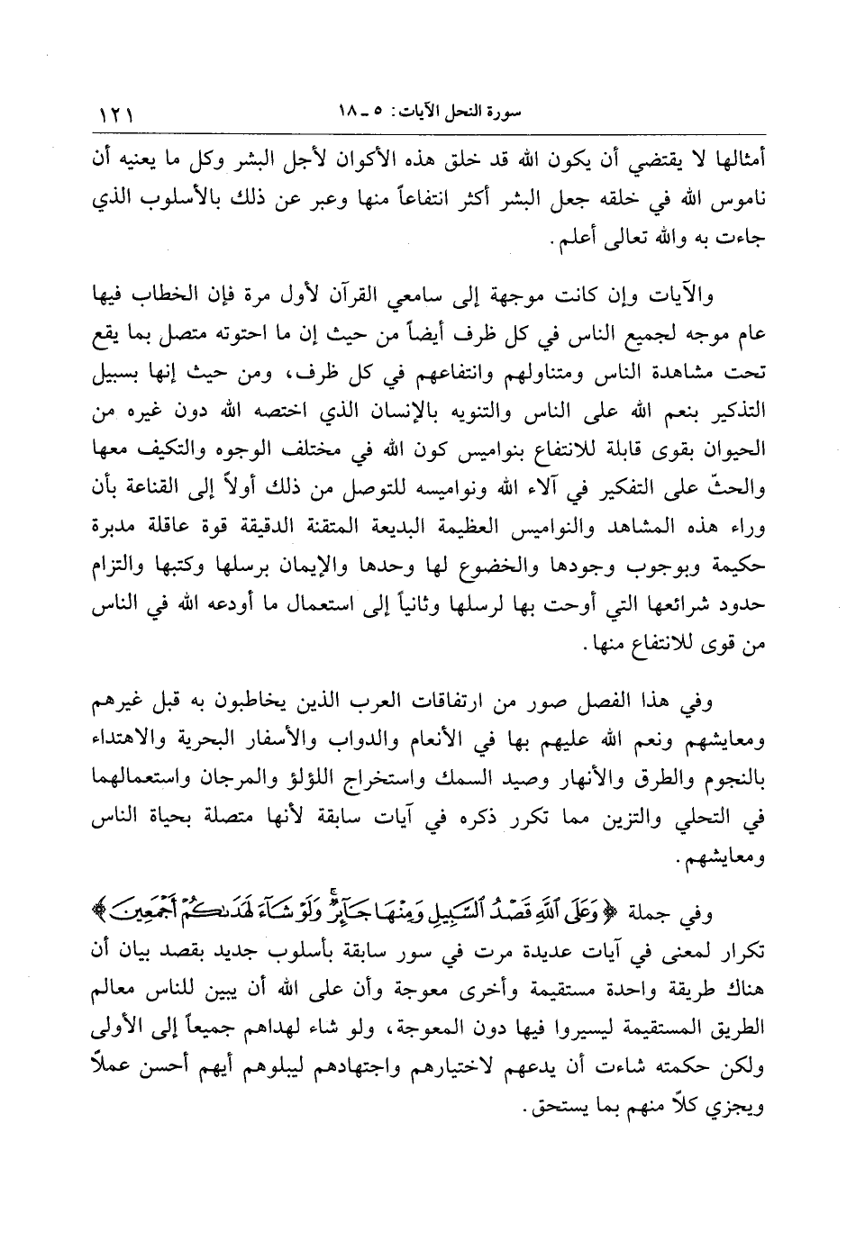 وفي جملة وَعَلَى اللَّهِ قَصْدُ السَّبِيلِ وَمِنْها جائِرٌ وَلَوْ شاءَ لَهَداكُمْ أَجْمَعِينَ تكرار لمعنى في آيات عديدة مرت في سور سابقة بأسلوب جديد بقصد بيان أن هناك طريقة واحدة مستقيمة وأخرى معوجة وأن على الله أن يبين للناس معالم الطريق المستقيمة ليسيروا فيها دون المعوجة، ولو شاء لهداهم جميعا إلى الأولى ولكن حكمته شاءت أن يدعهم لاختيارهم واجتهادهم ليبلوهم أيهم أحسن عملا ويجزي كلا منهم بما يستحق.