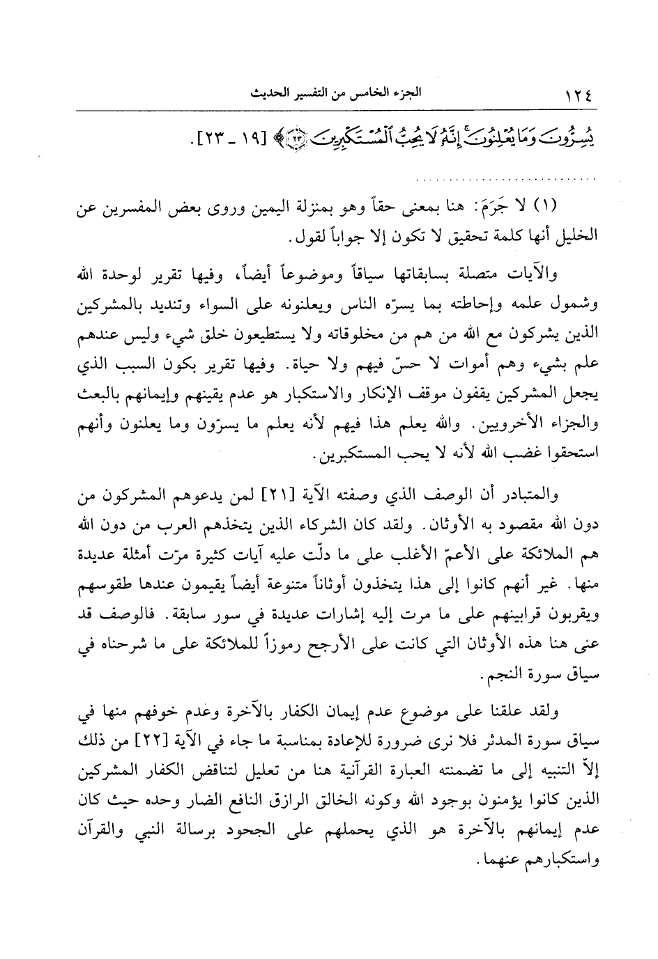 ولقد علقنا على موضوع عدم إيمان الكفار بالآخرة وعدم خوفهم منها في سياق سورة المدثر فلا نرى ضرورة للإعادة بمناسبة ما جاء في الآية [22] من ذلك إلّا التنبيه إلى ما تضمنته العبارة القرآنية هنا من تعليل لتناقض الكفار المشركين الذين كانوا يؤمنون بوجود الله وكونه الخالق الرازق النافع الضار وحده حيث كان عدم إيمانهم بالآخرة هو الذي يحملهم على الجحود برسالة النبي والقرآن واستكبارهم عنهما.